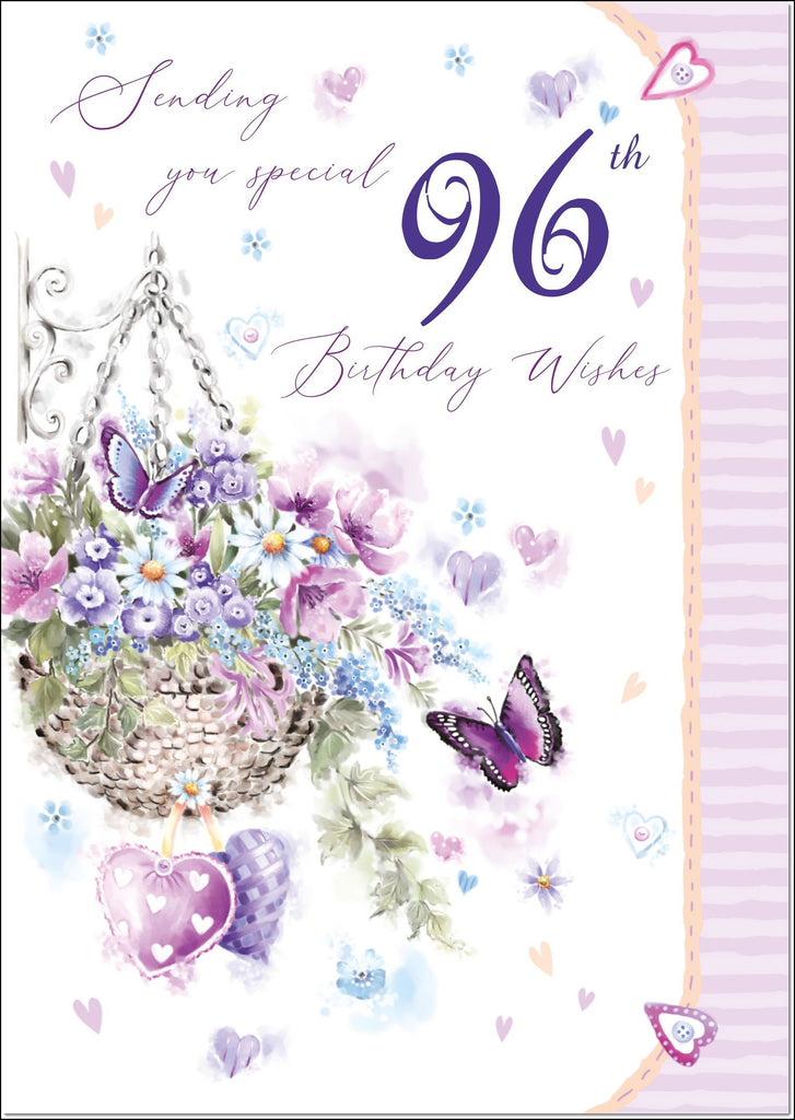 96th Birthday Card Age 96 for Her Purple Hanging Basket
