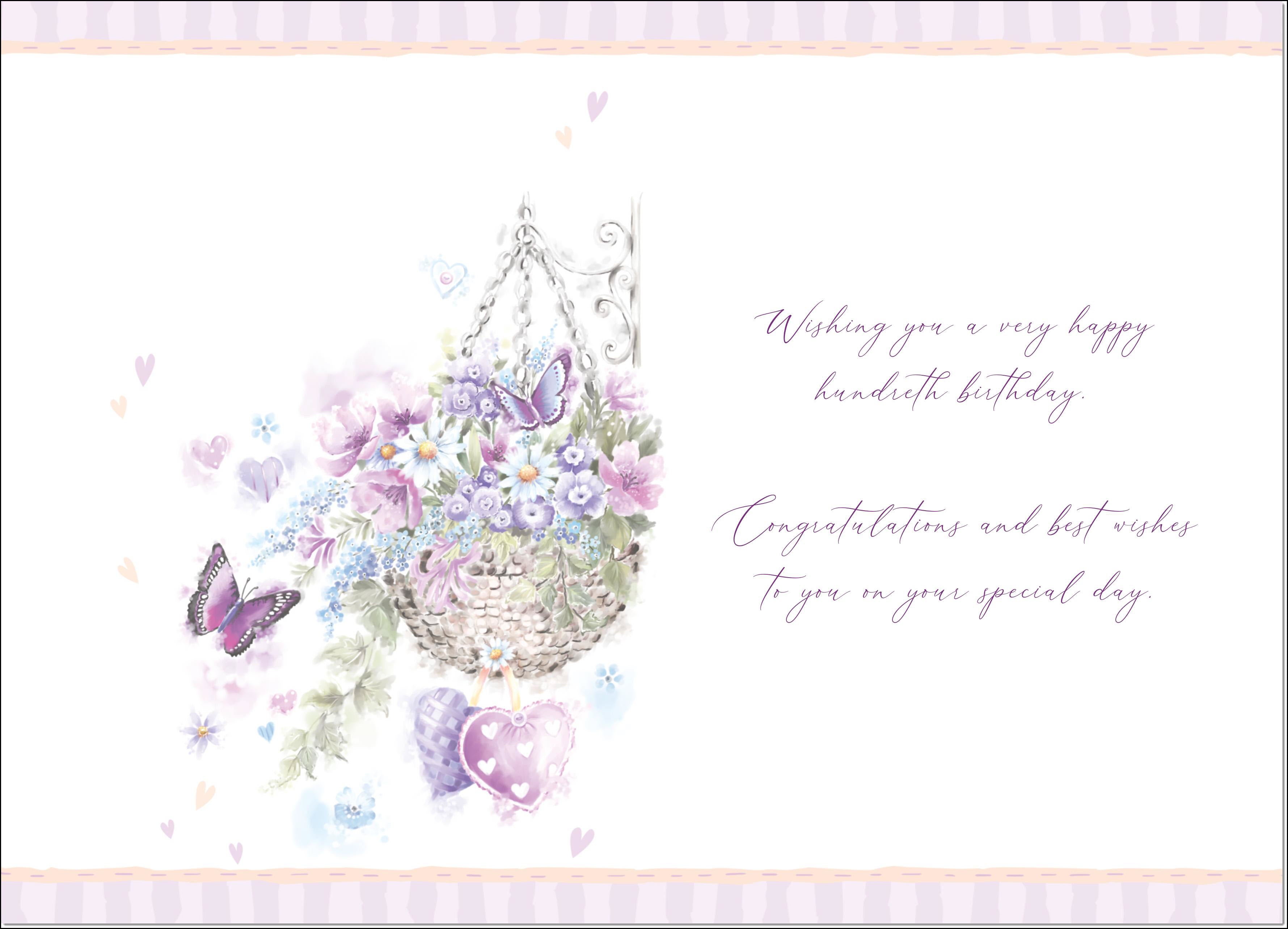 100th Birthday Card Age 100 for Her Purple Hanging Basket