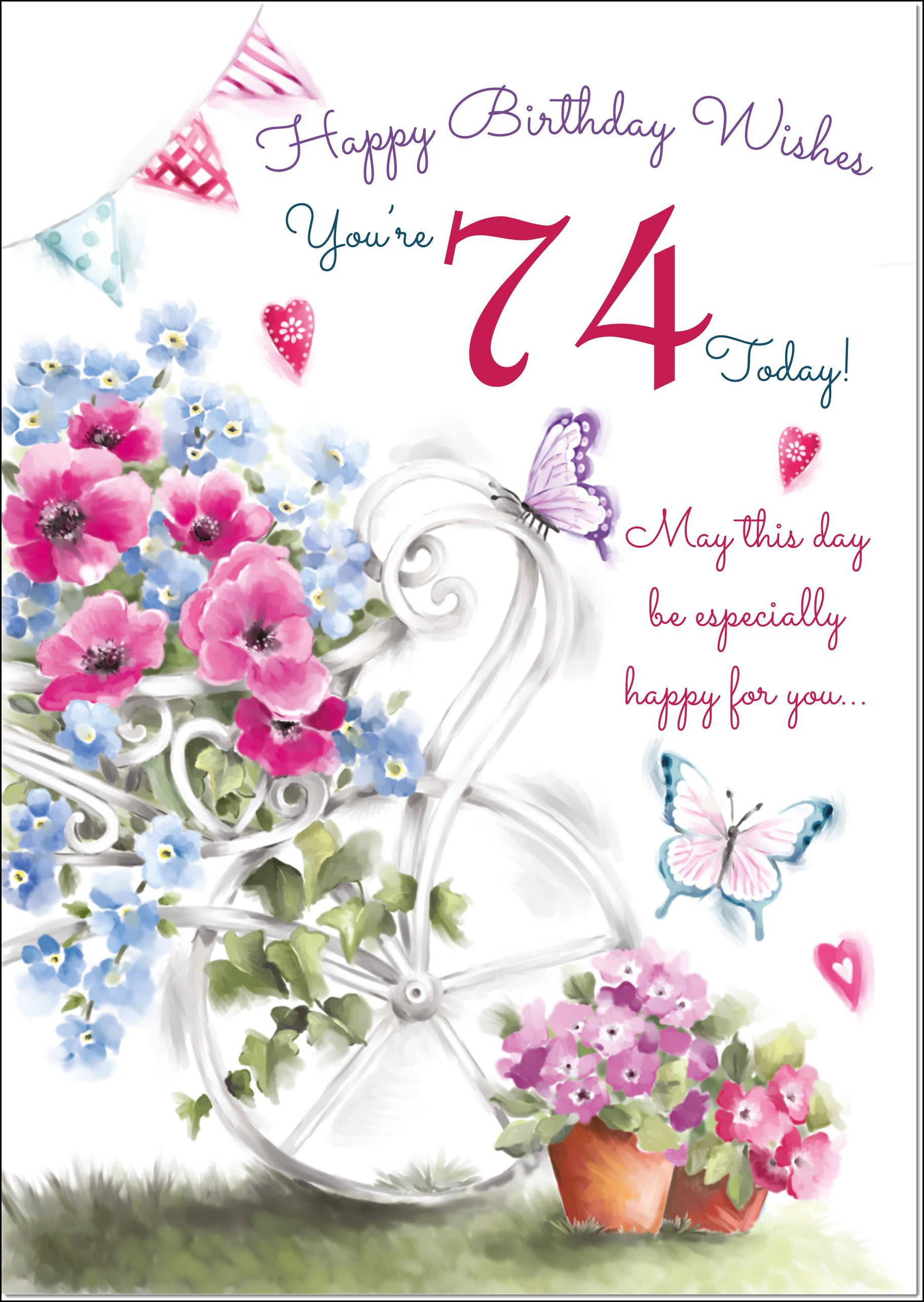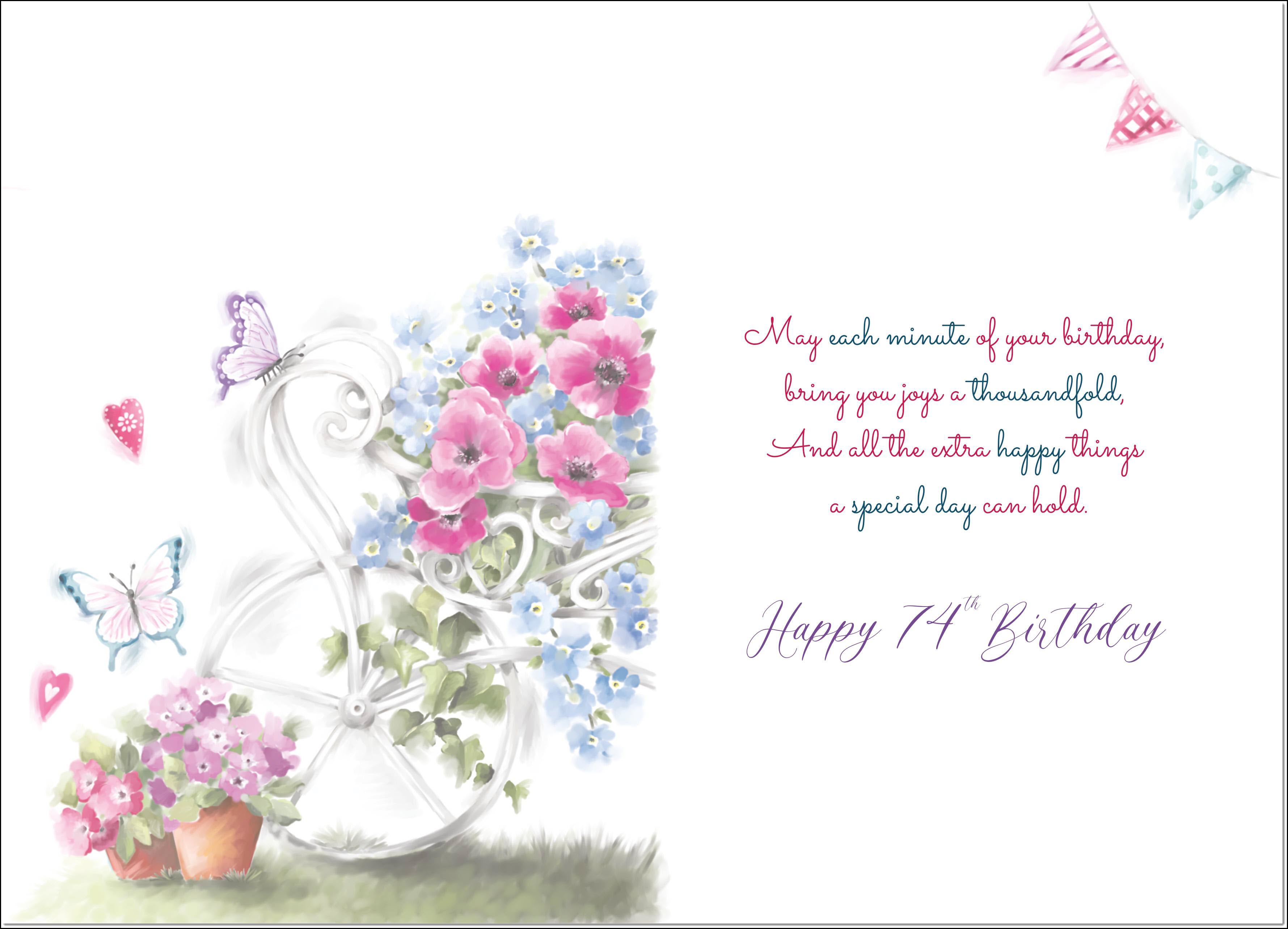 74th Birthday Card Age 74 for Her Garden Wheelbarrow Bouquet