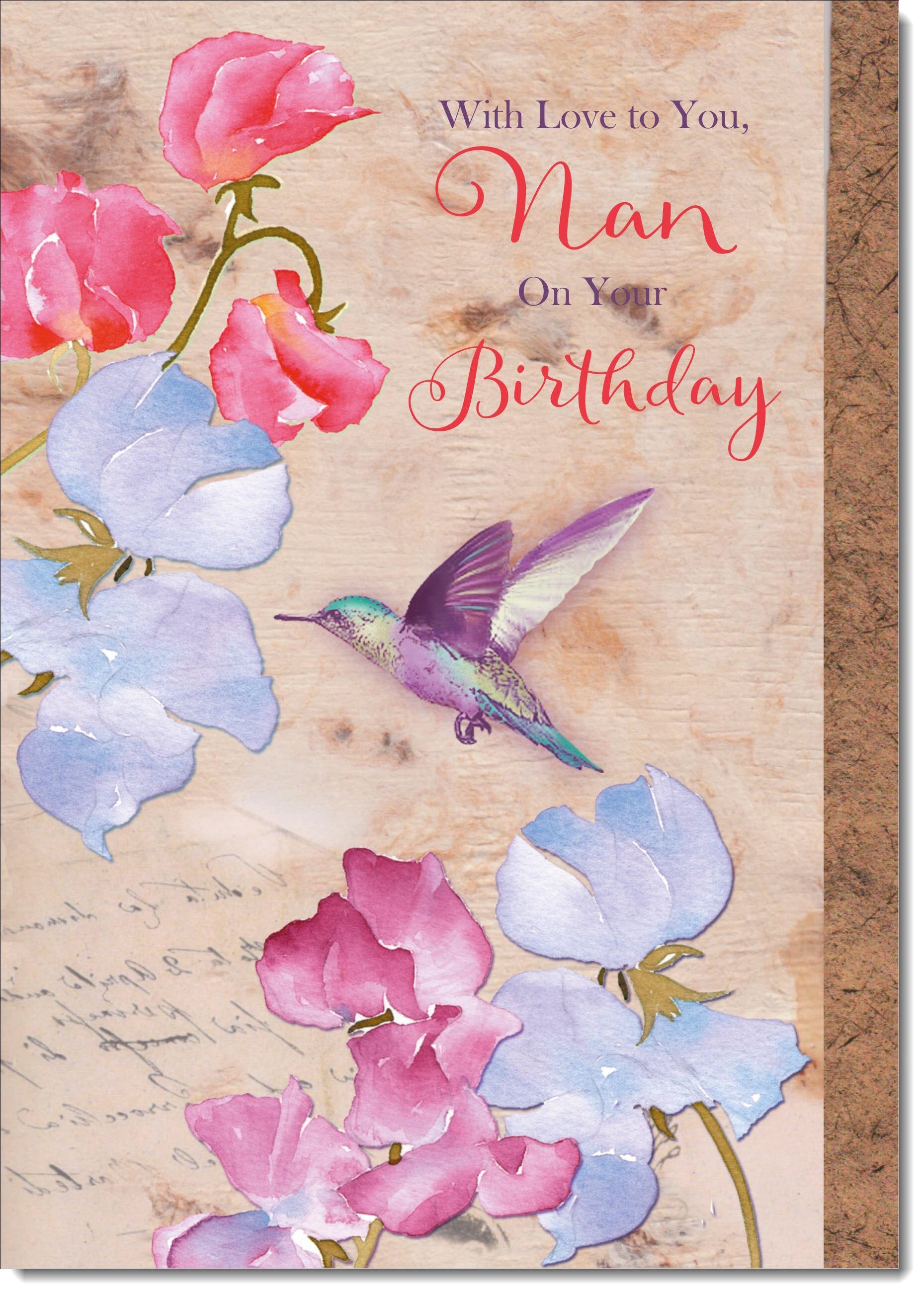 Nan Birthday Card Sweet Pea and Hummingbirds