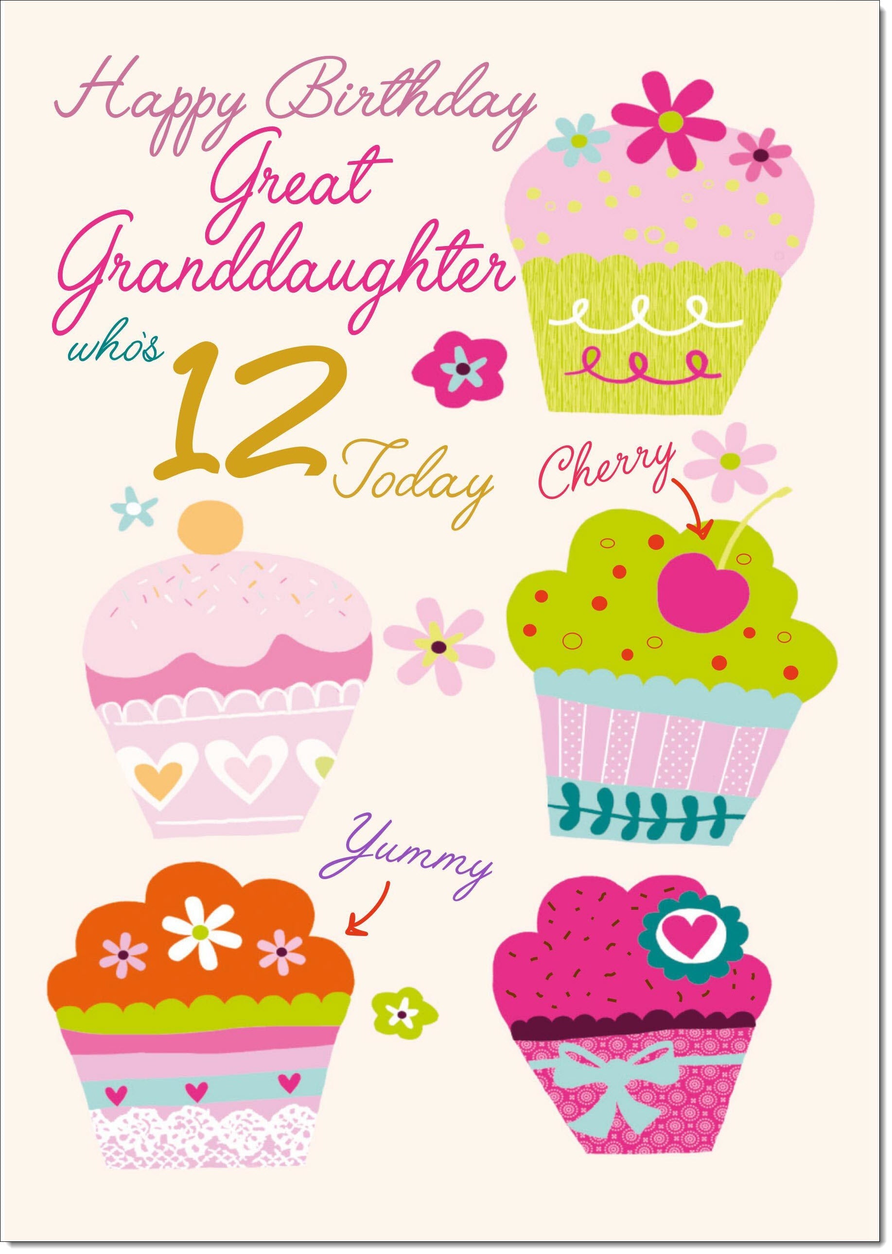 Great Granddaughter 12th Birthday Card Age 12 Bright Cupcakes