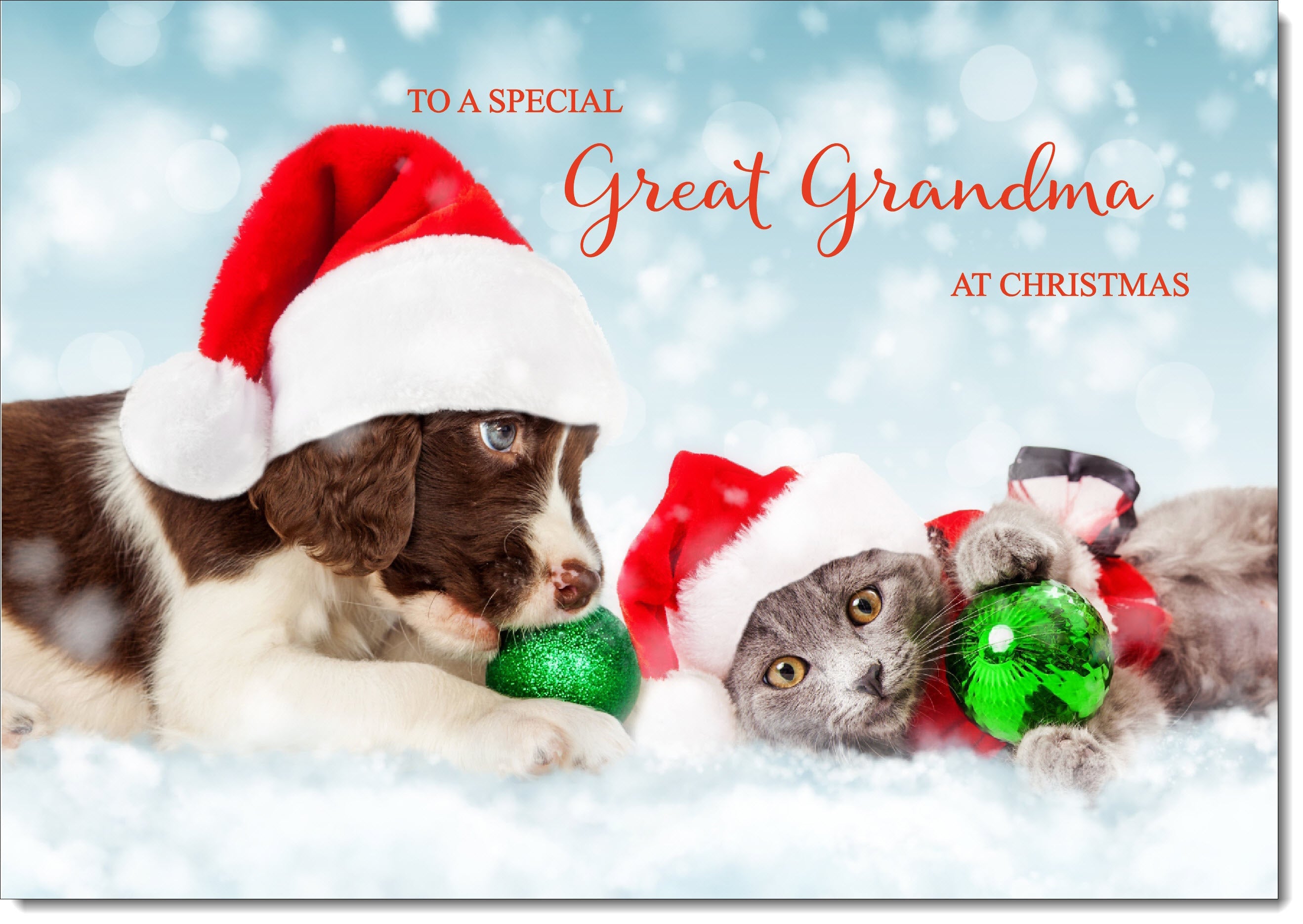 Great Grandma Christmas Card Puppy and Kitten with Santa Hats