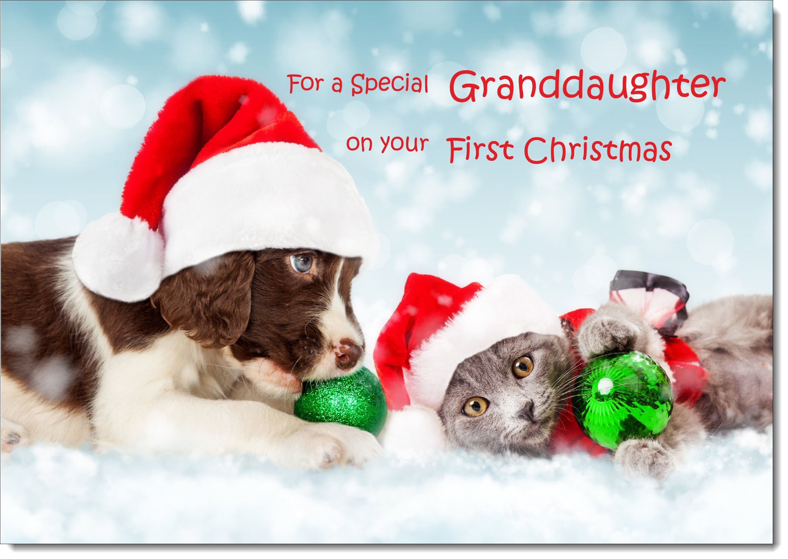 Granddaughters 1st Christmas Card Puppy and Kitten with Santa Hats