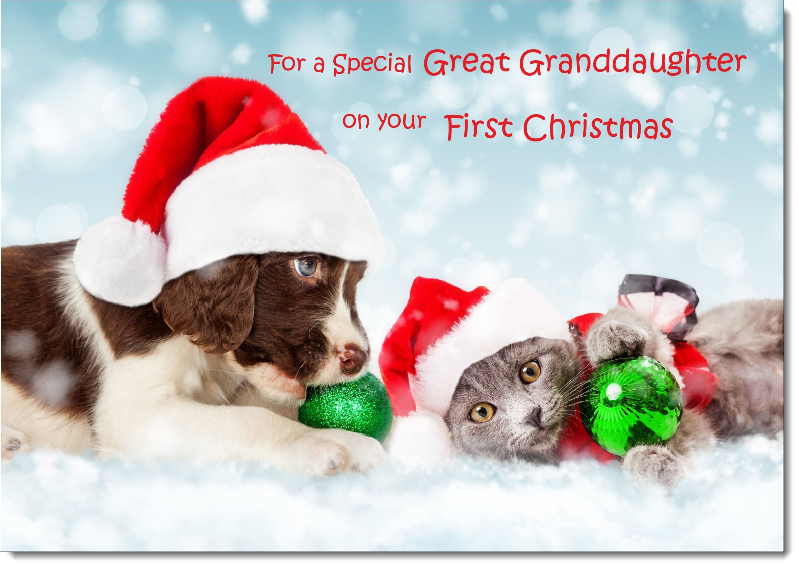 Great Granddaughters 1st Christmas Card Puppy and Kitten with Santa Hats