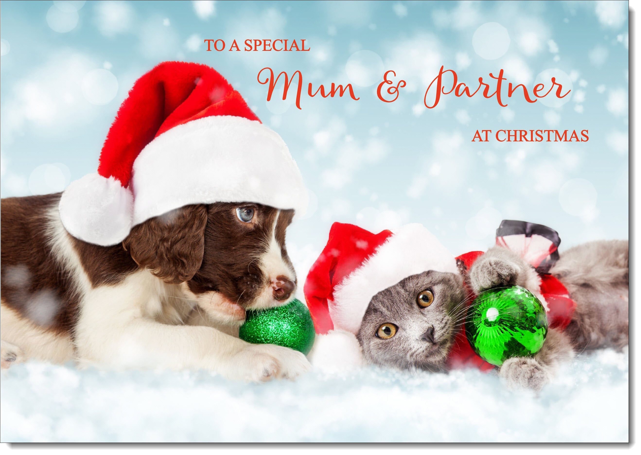 Mum & Partner Christmas Card Puppy and Kitten with Santa Hats