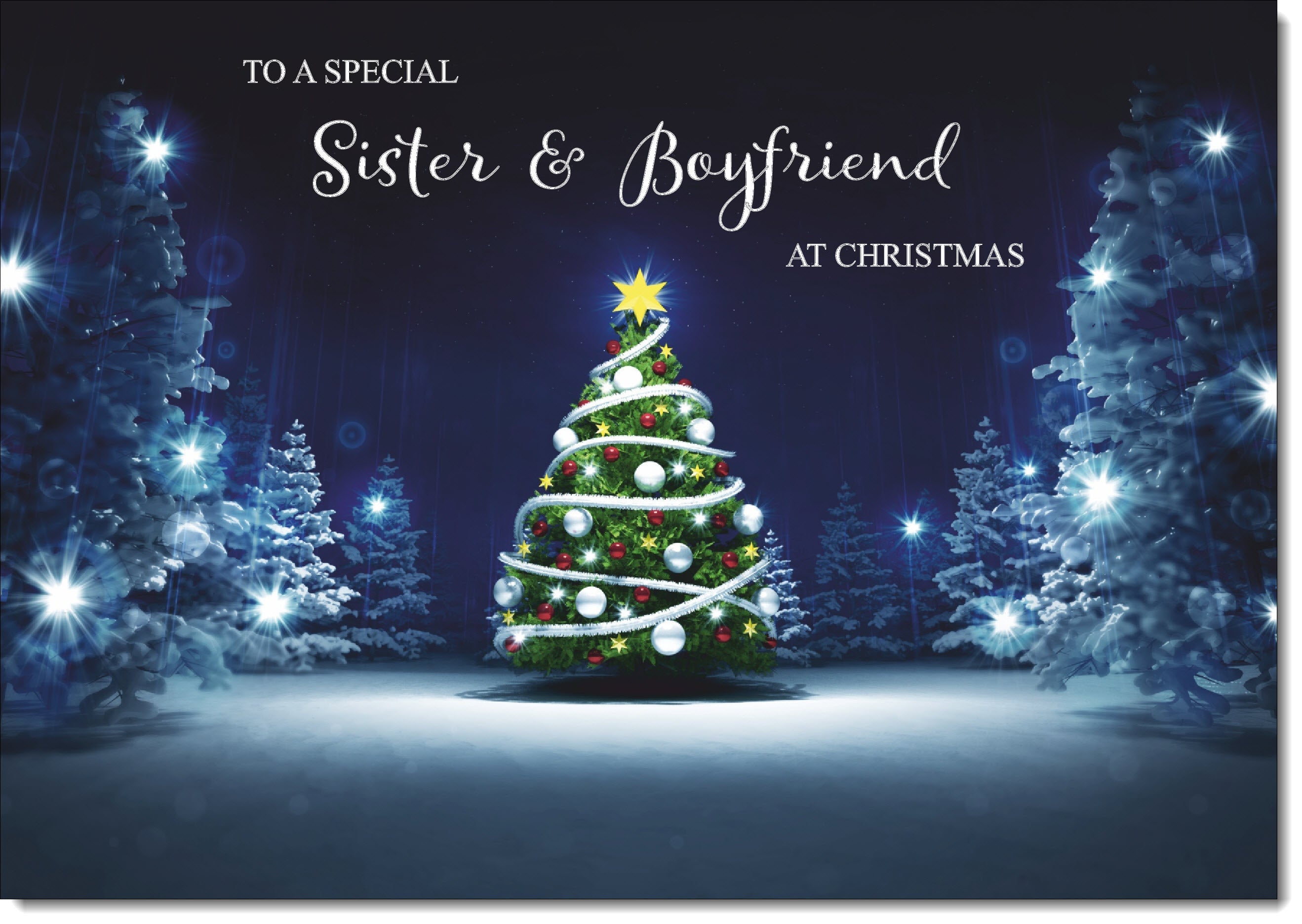 Sister & Boyfriend Christmas Card Christmas Tree Lights in Dark Sky