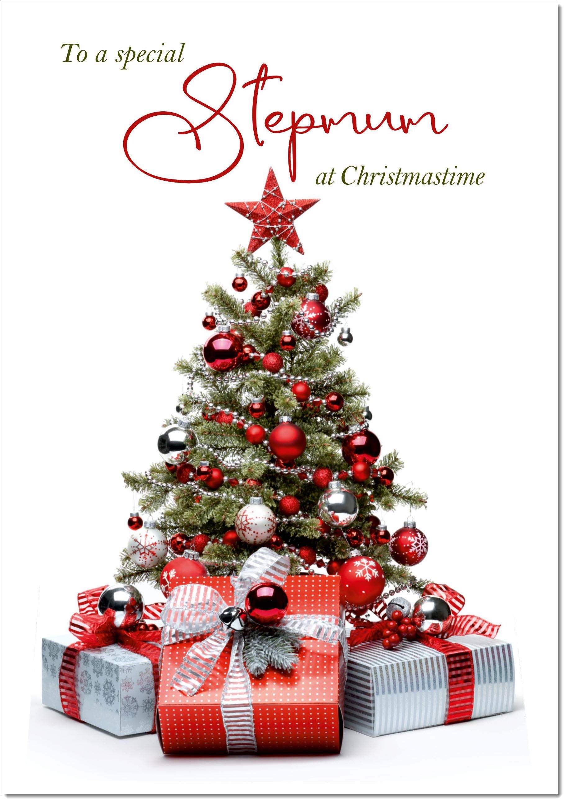 Stepmum Christmas Card Christmas Tree and Parcels