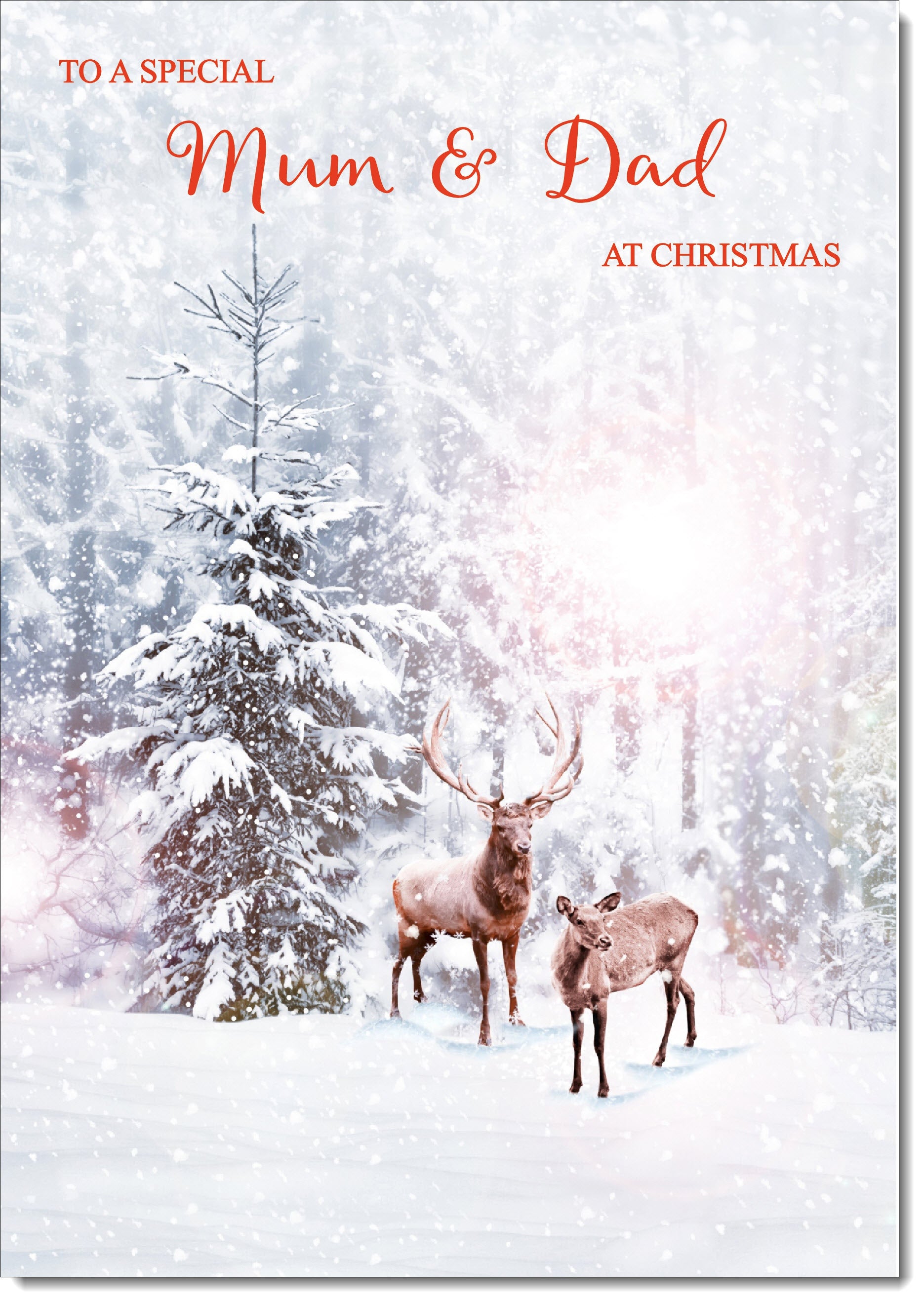 Mum & Dad Christmas Card Stag and Doe in Snowy Forest