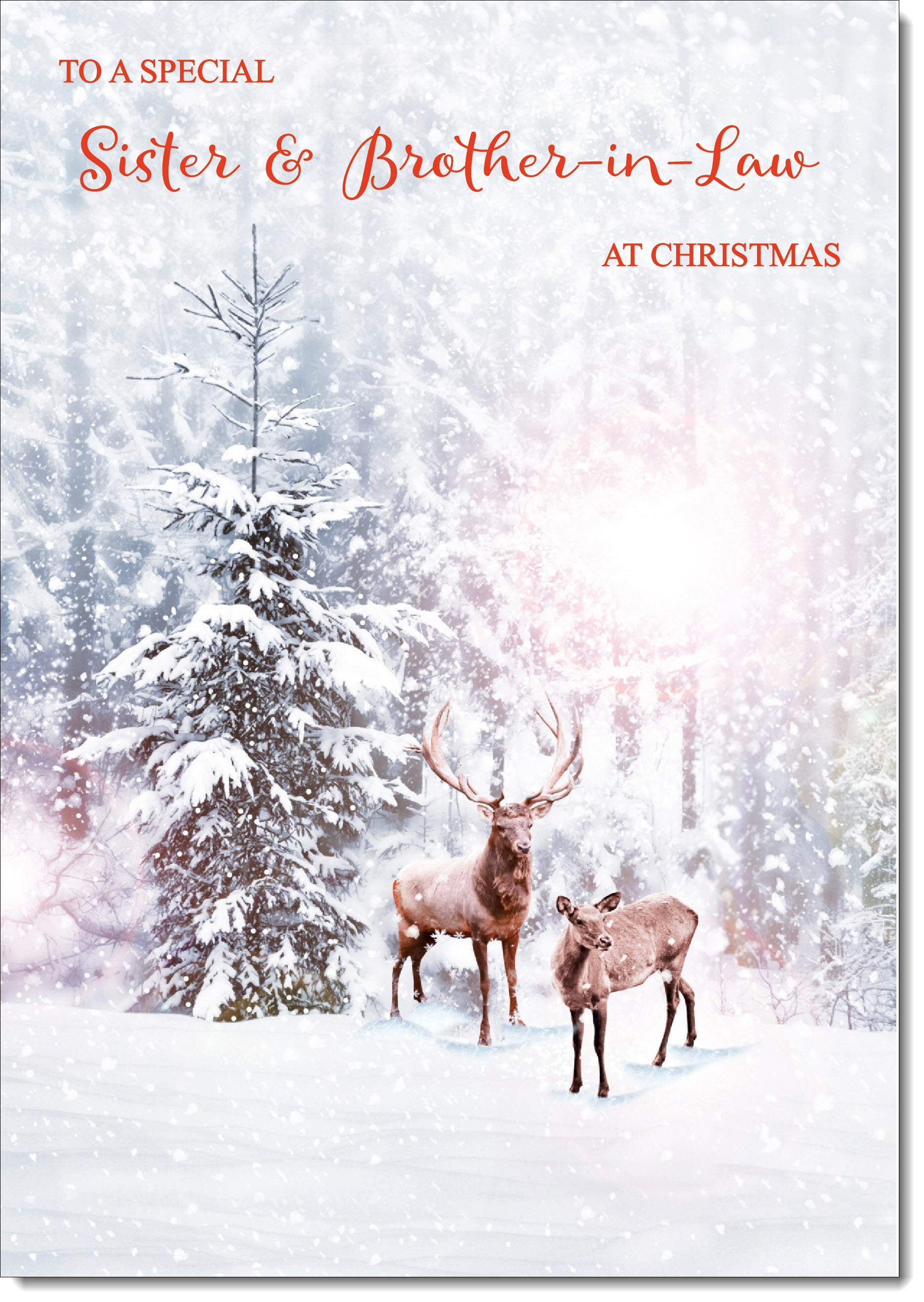 Sister & Brother-in-Law Christmas Card Stag and Doe in Snowy Forest