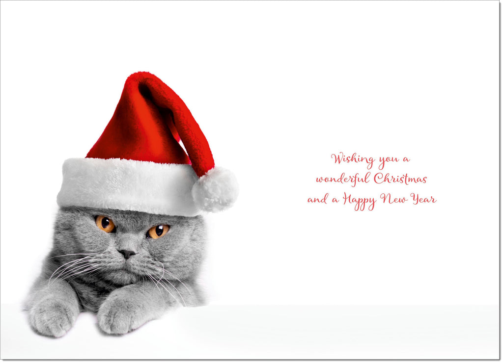 Neighbours Christmas Card Grey Cat with Santa Hat