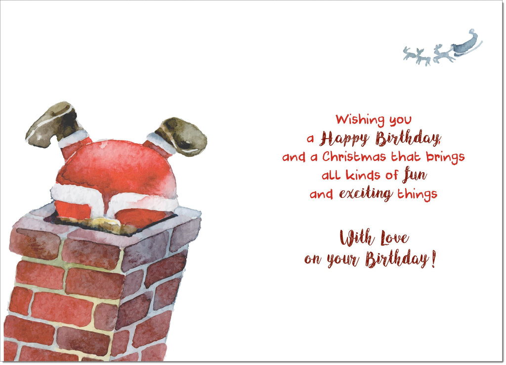 December Birthday Christmas Card Santa Stuck in the Chimney