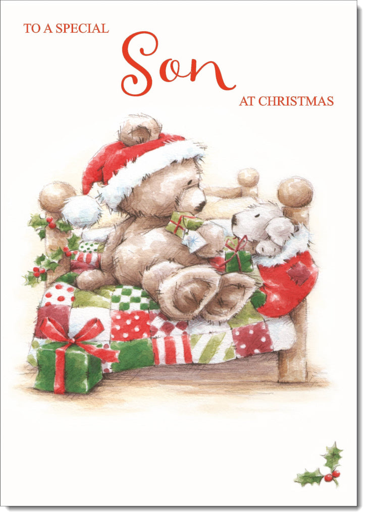 Son Christmas Card Cute Bear on Bed