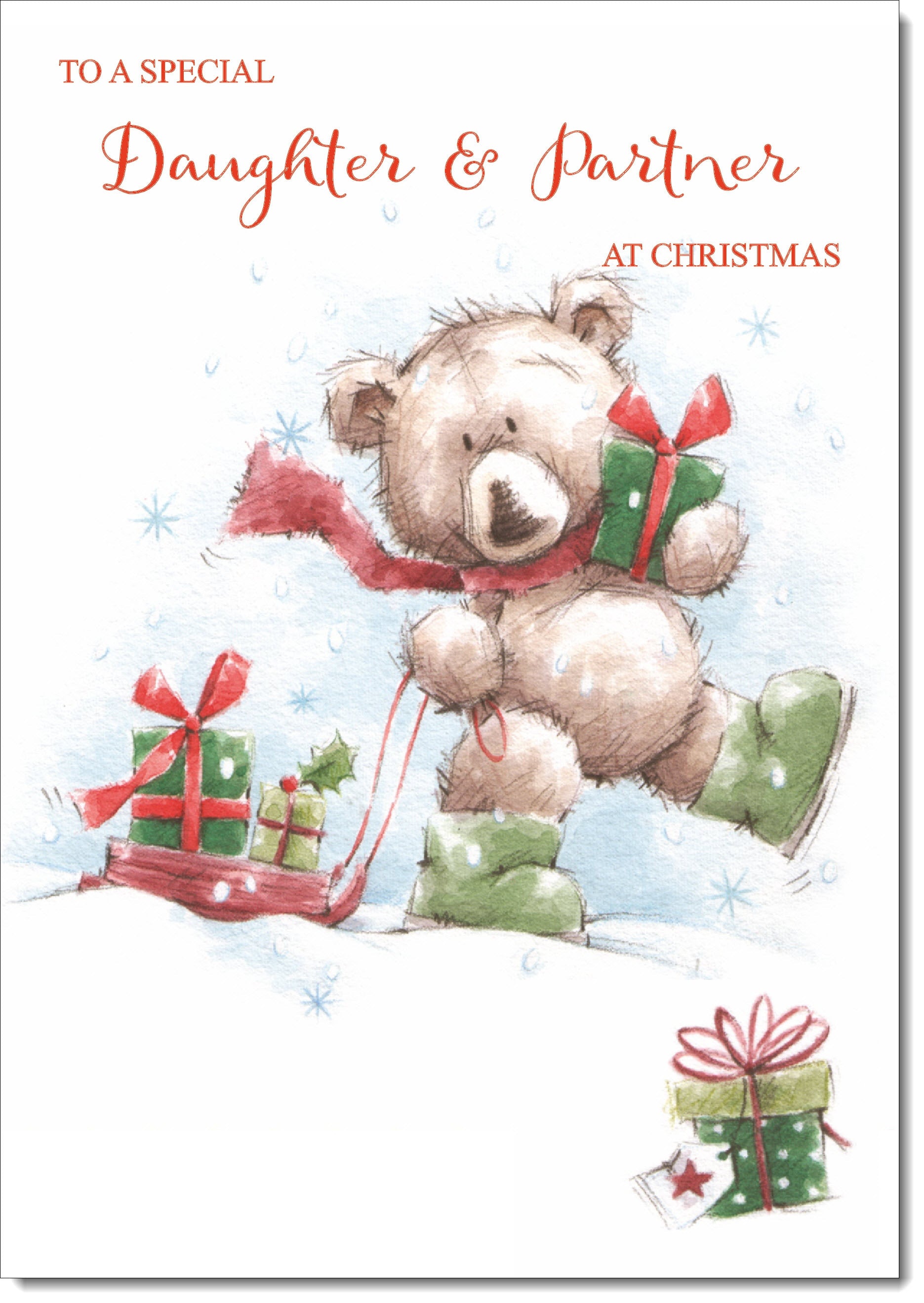 Daughter & Partner Christmas Card Cute Bear with Sled