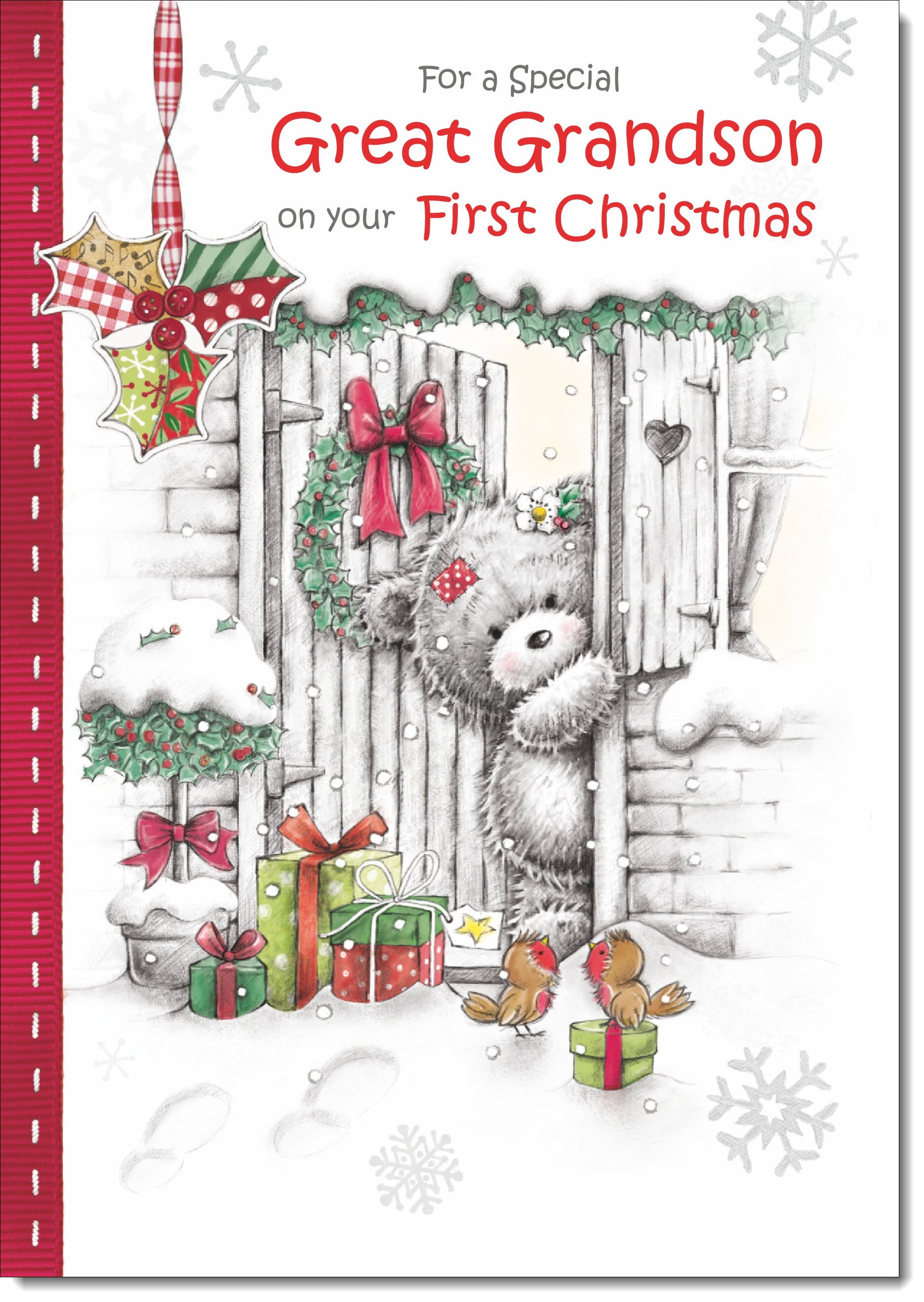 Great Grandsons 1st Christmas Card Grey Bear in Snow