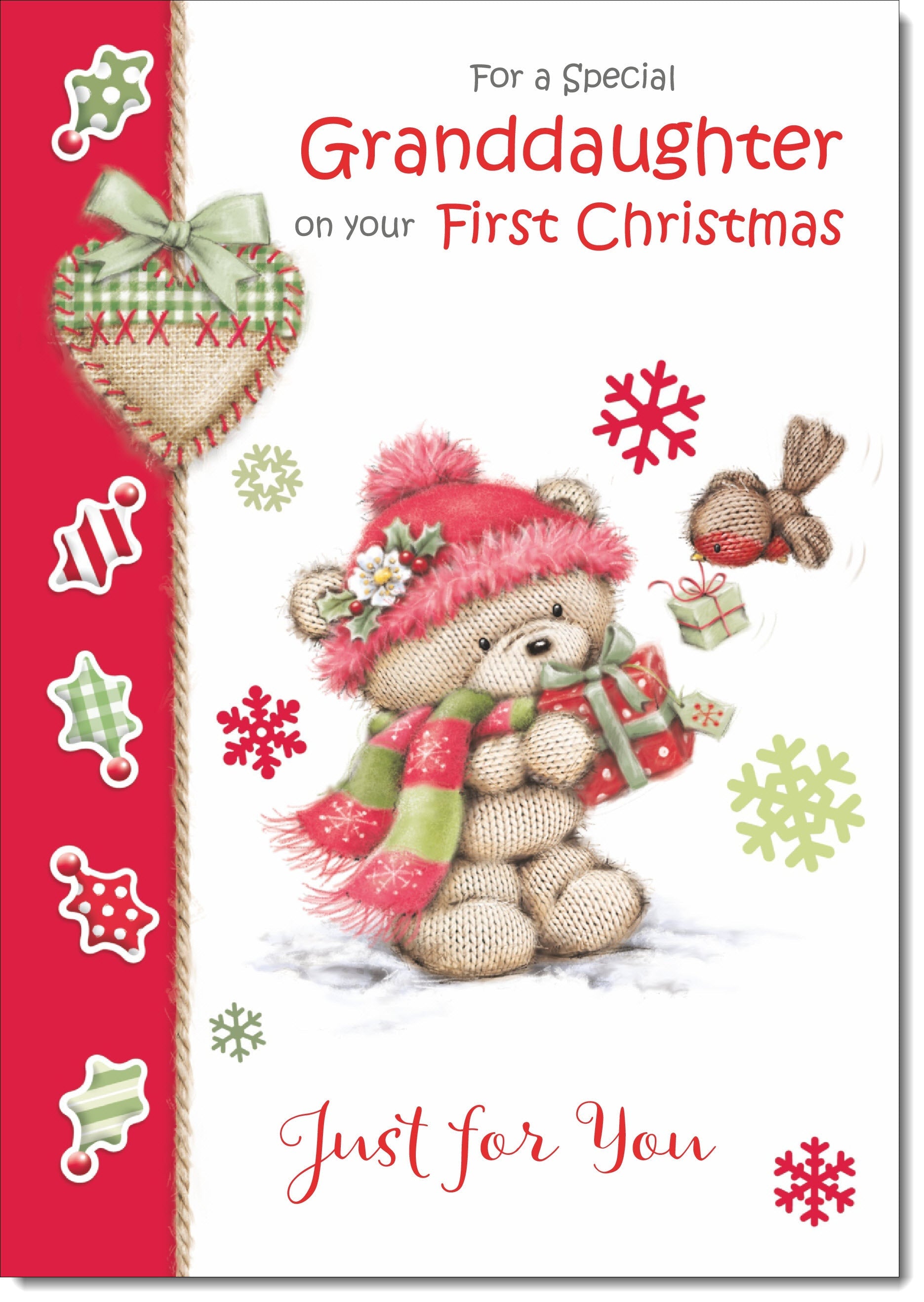 Granddaughters 1st Christmas Card Cute Bear in Pink Bobble Hat