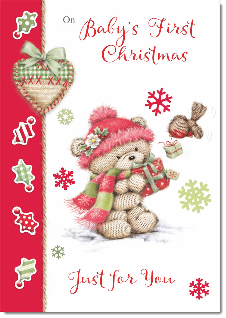 Babys 1st Christmas Card Cute Bear in Pink Bobble Hat