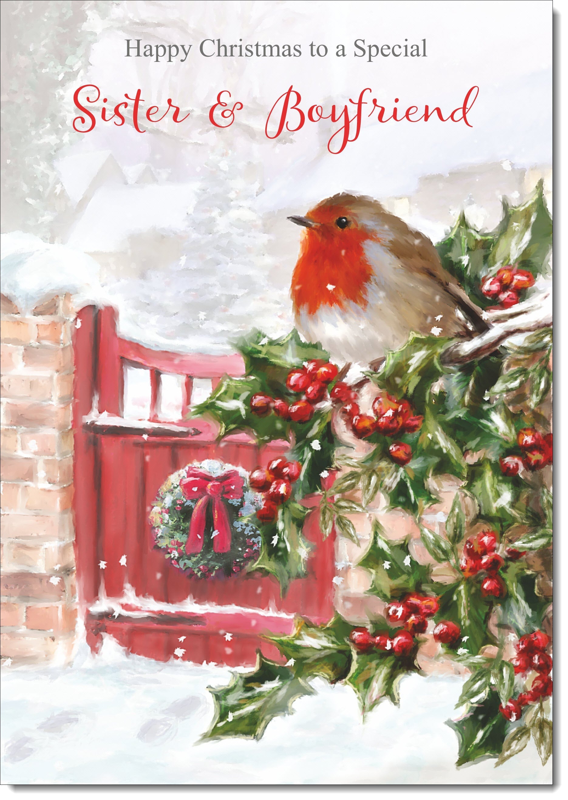 Sister & Boyfriend Christmas Card Robin on Holly Tree