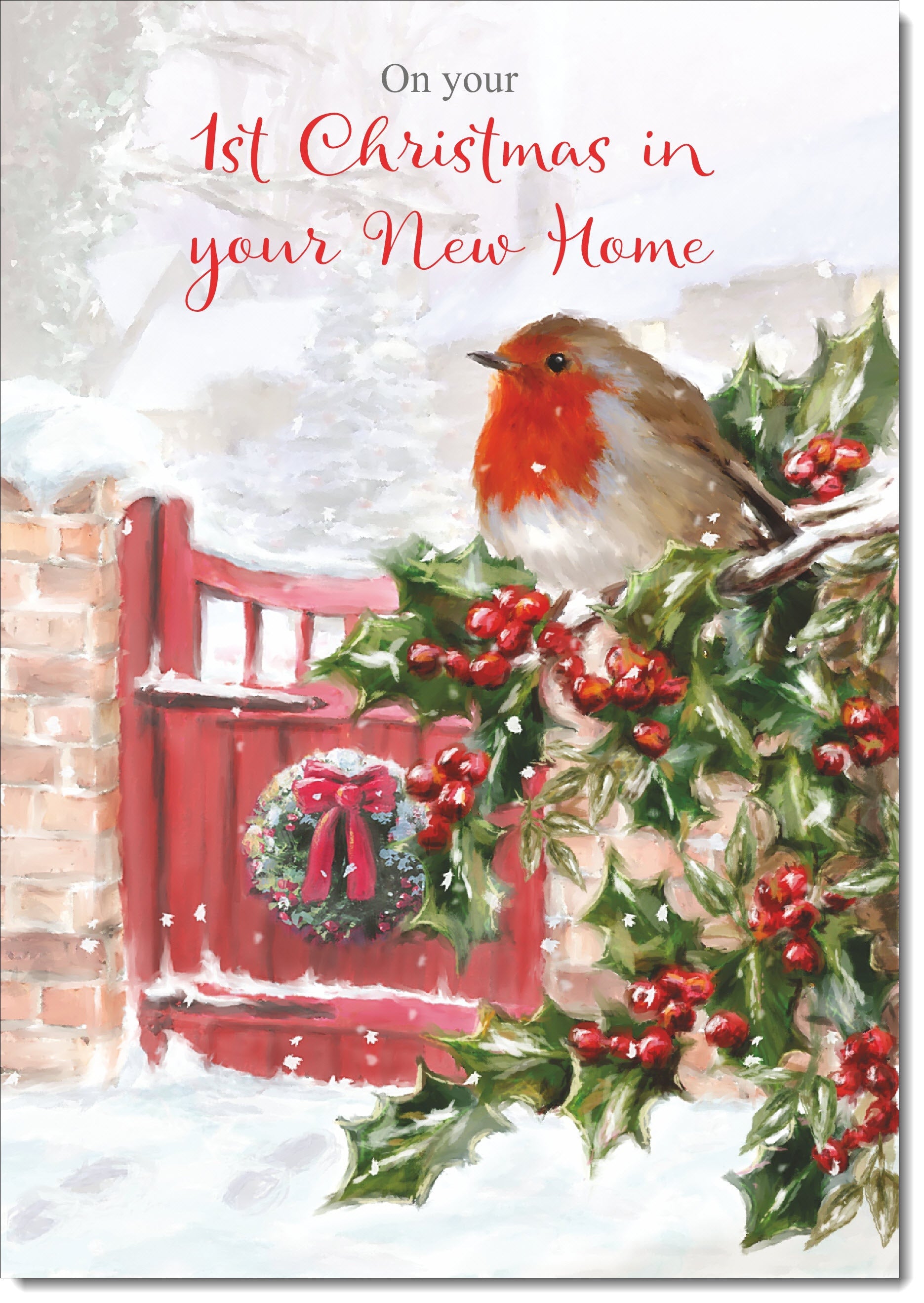 1st Christmas in New Home Card Robin on Holly Tree