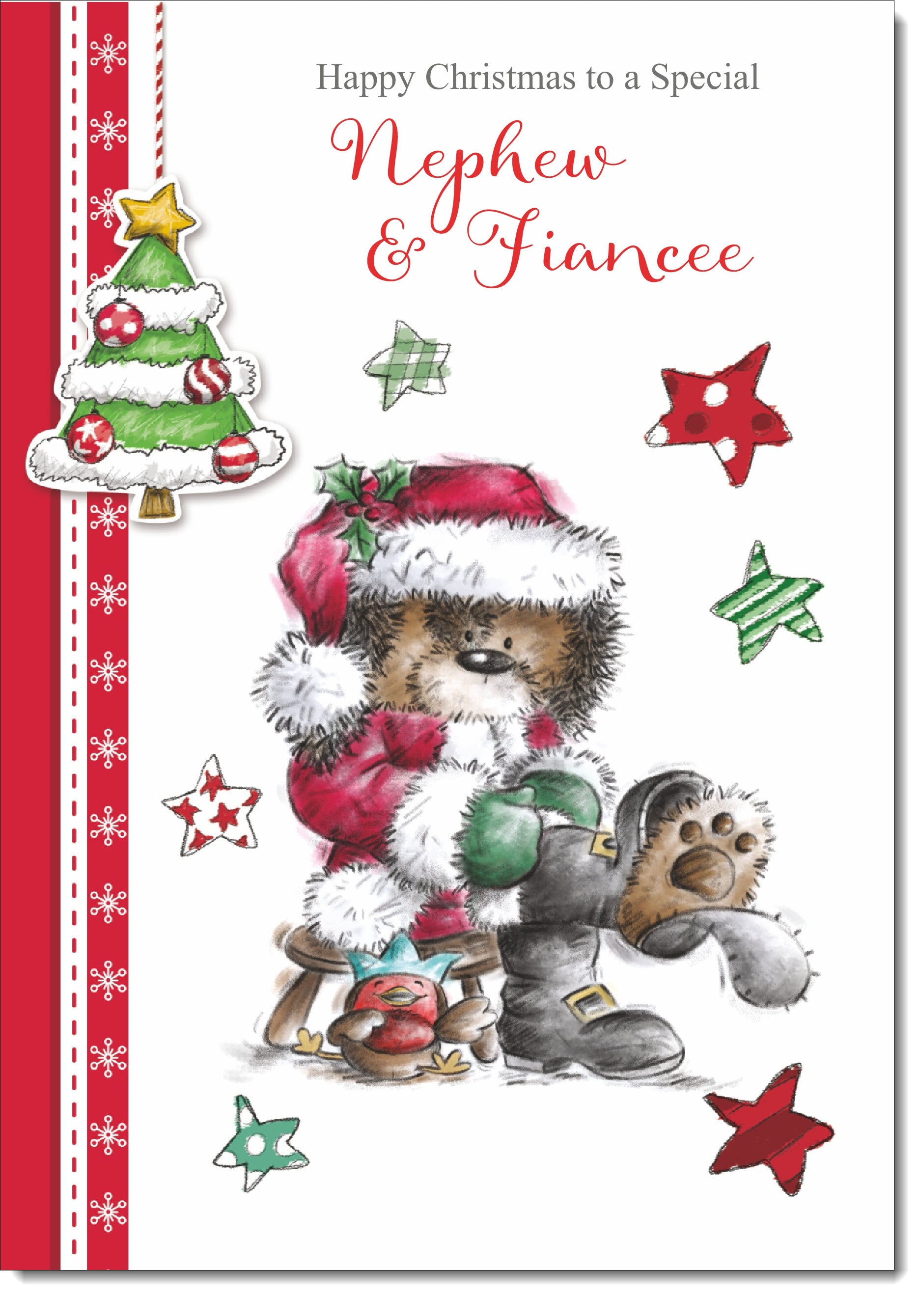 Nephew & Fiancee Christmas Card Funny Santa Bear and Broken Boot