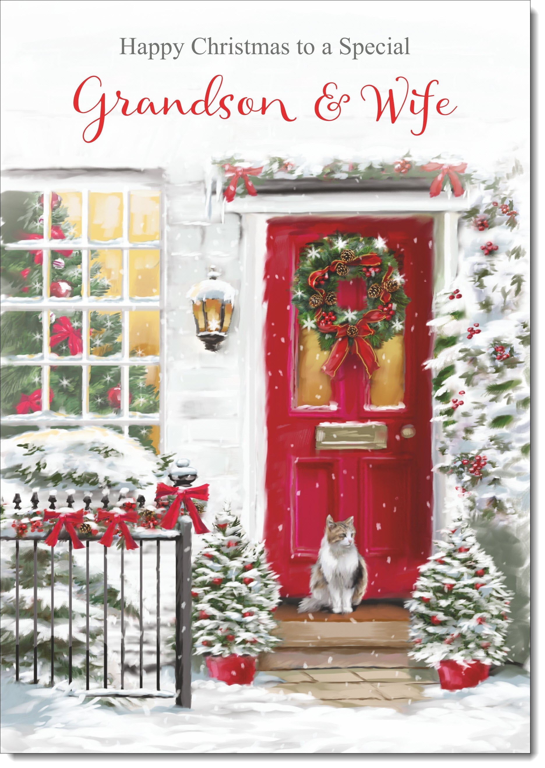 Grandson & Wife Christmas Card Cat by Snowy Red Door