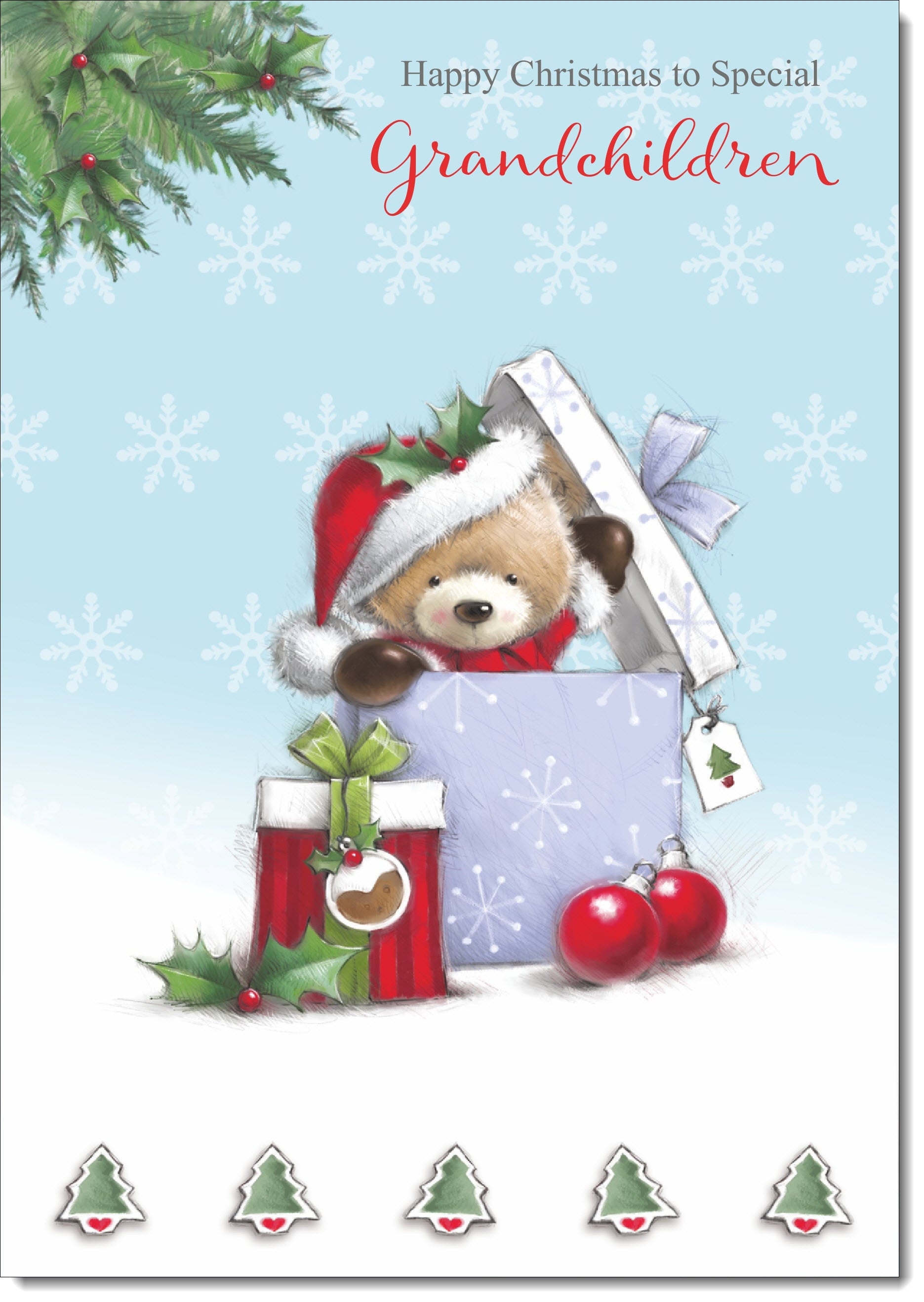 Grandchildren Christmas Card Cute Bear in Christmas Parcel