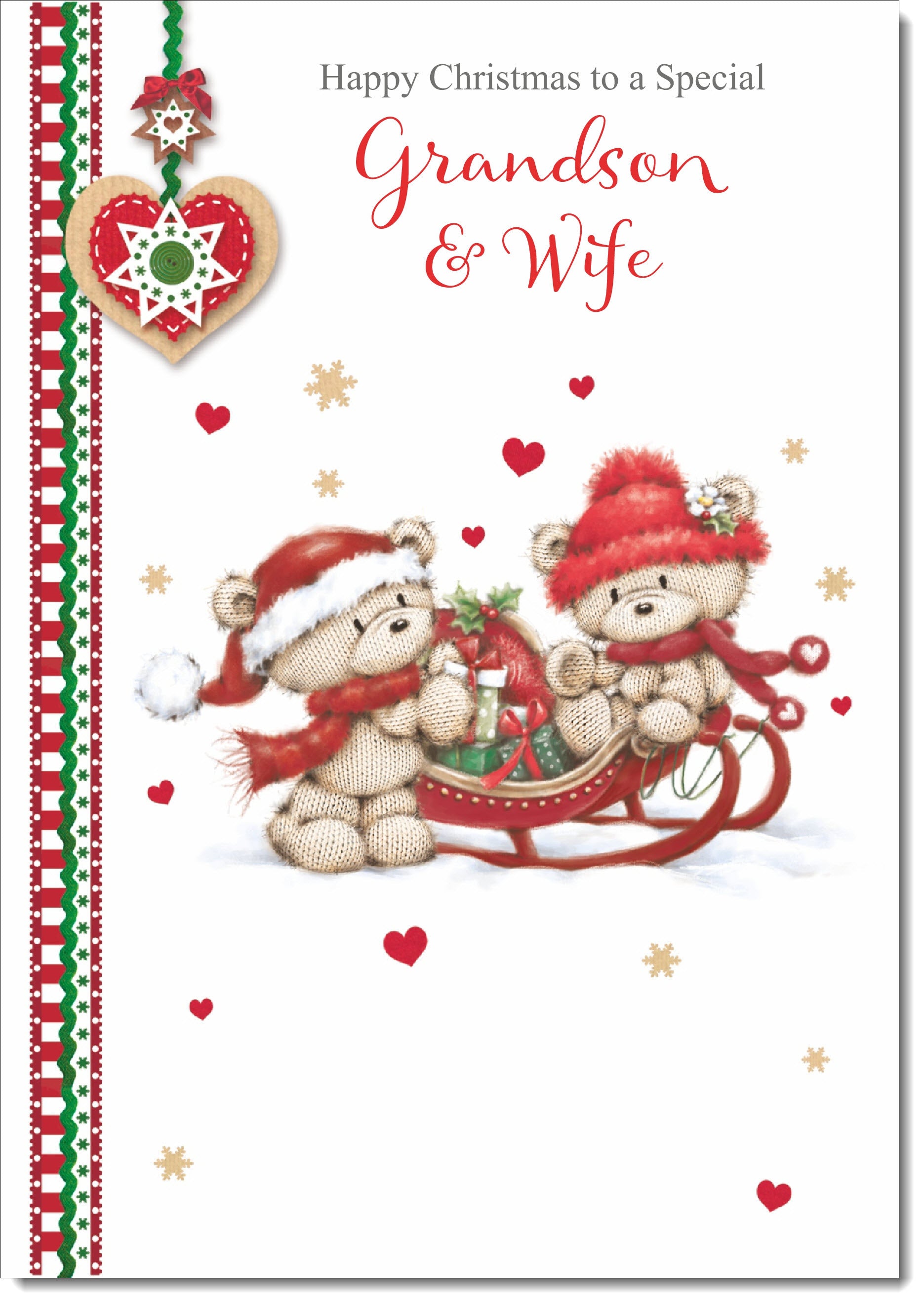 Grandson & Wife Christmas Card Two Cute Bears on Sled