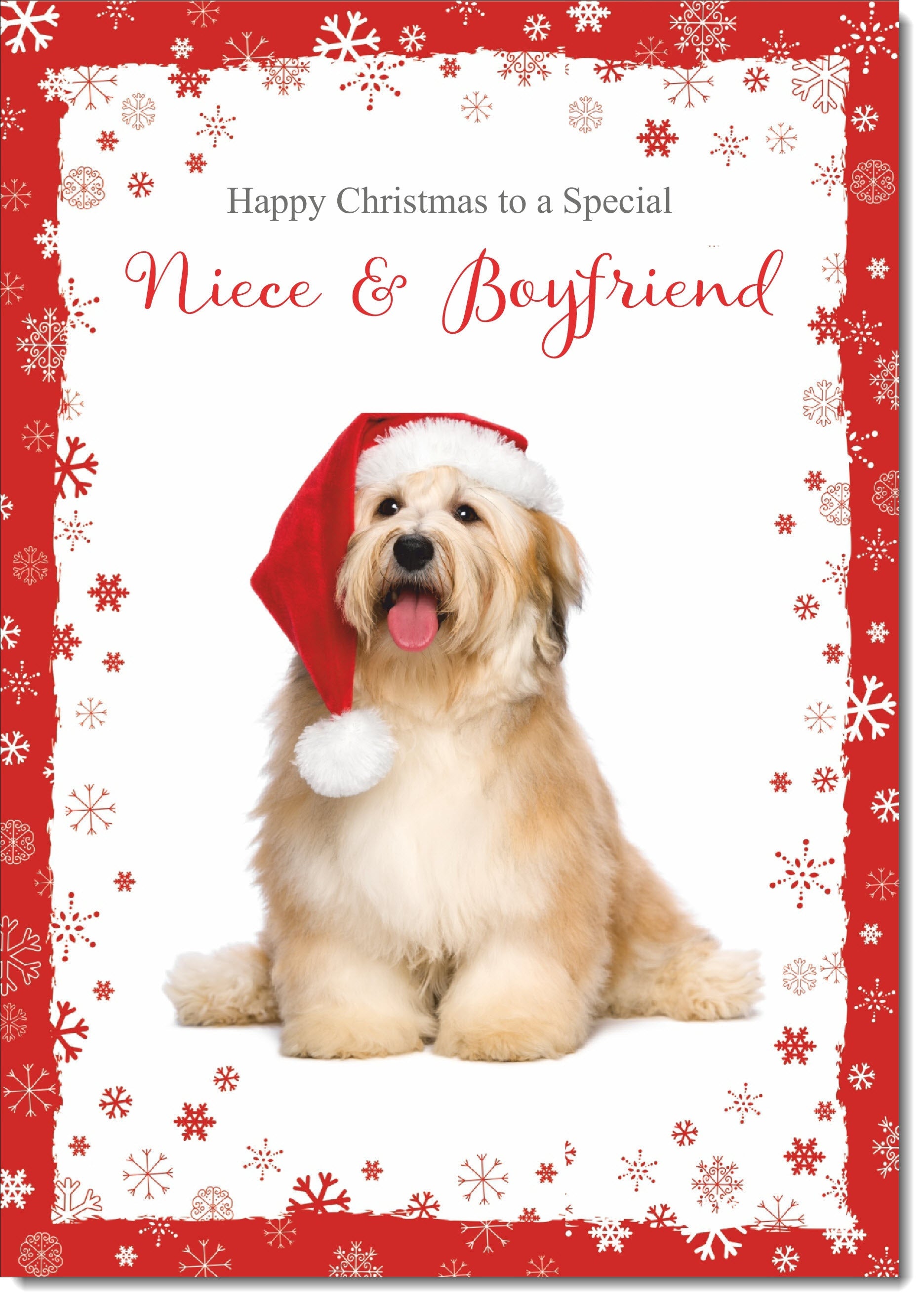 Niece & Boyfriend Christmas Card Fluffy Dog in Santa Hat