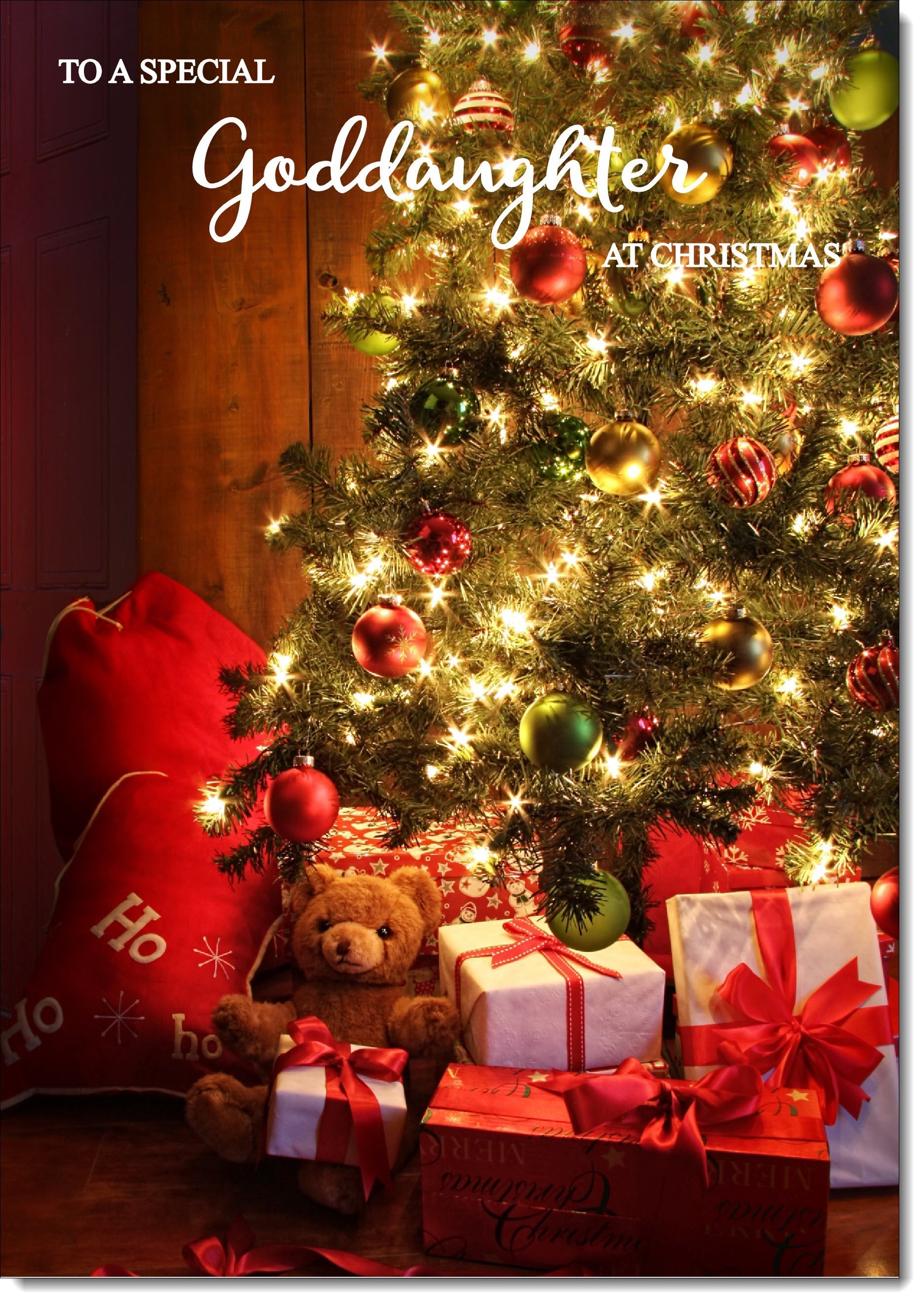 Goddaughter Christmas Card Teddy by Christmas Tree