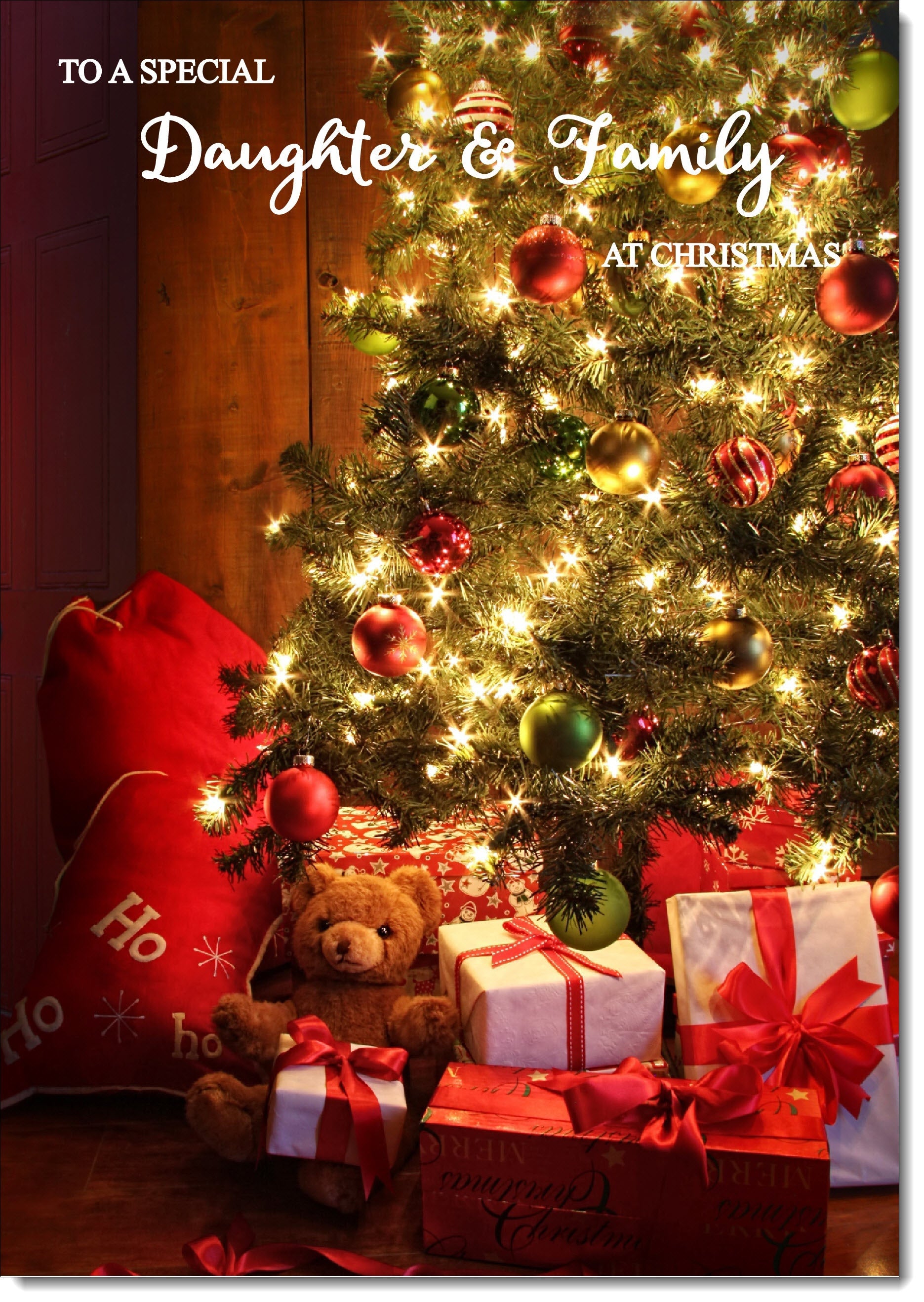 Daughter & Family Christmas Card Teddy by Christmas Tree