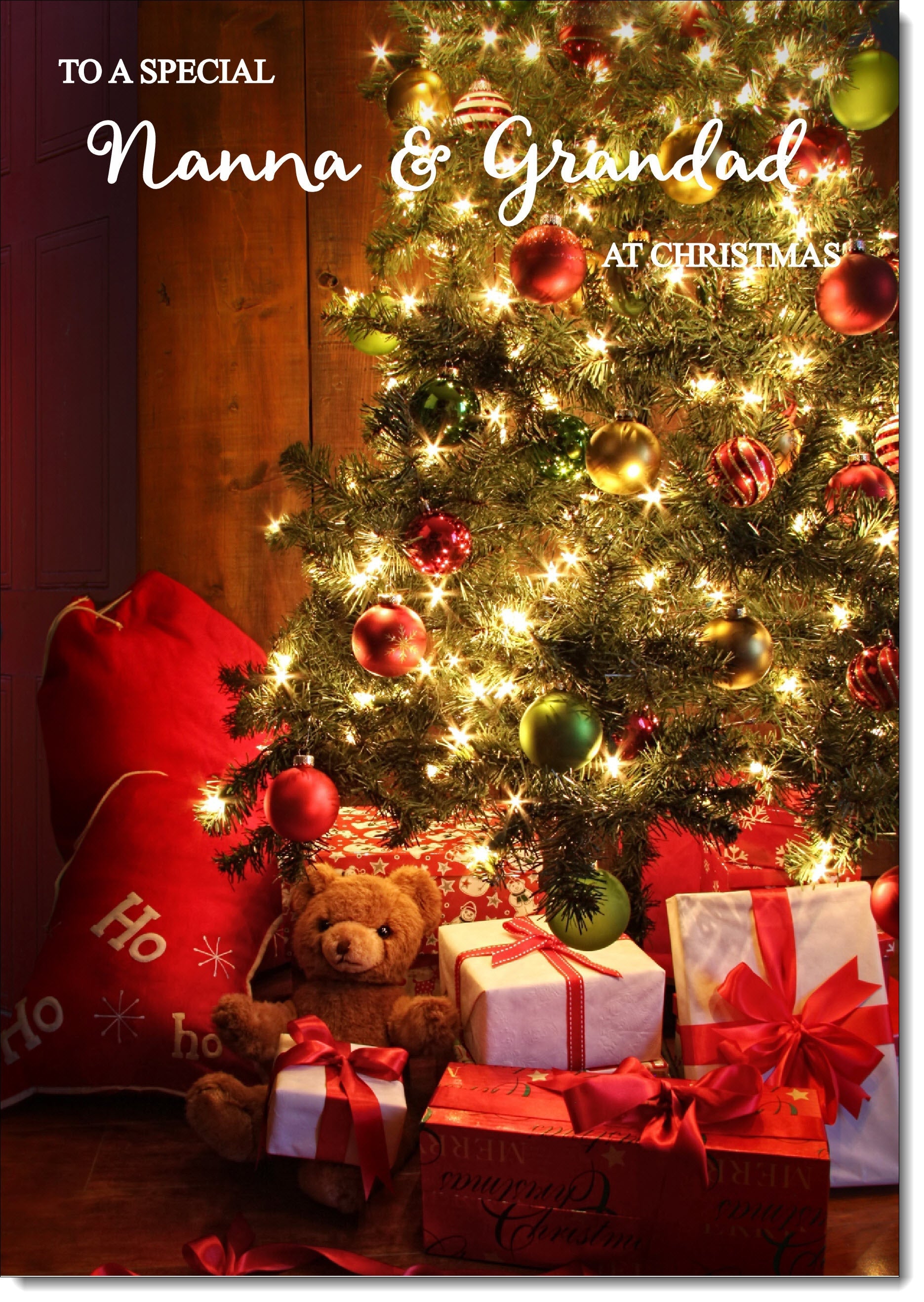 Nanna & Grandad Christmas Card Teddy by Christmas Tree