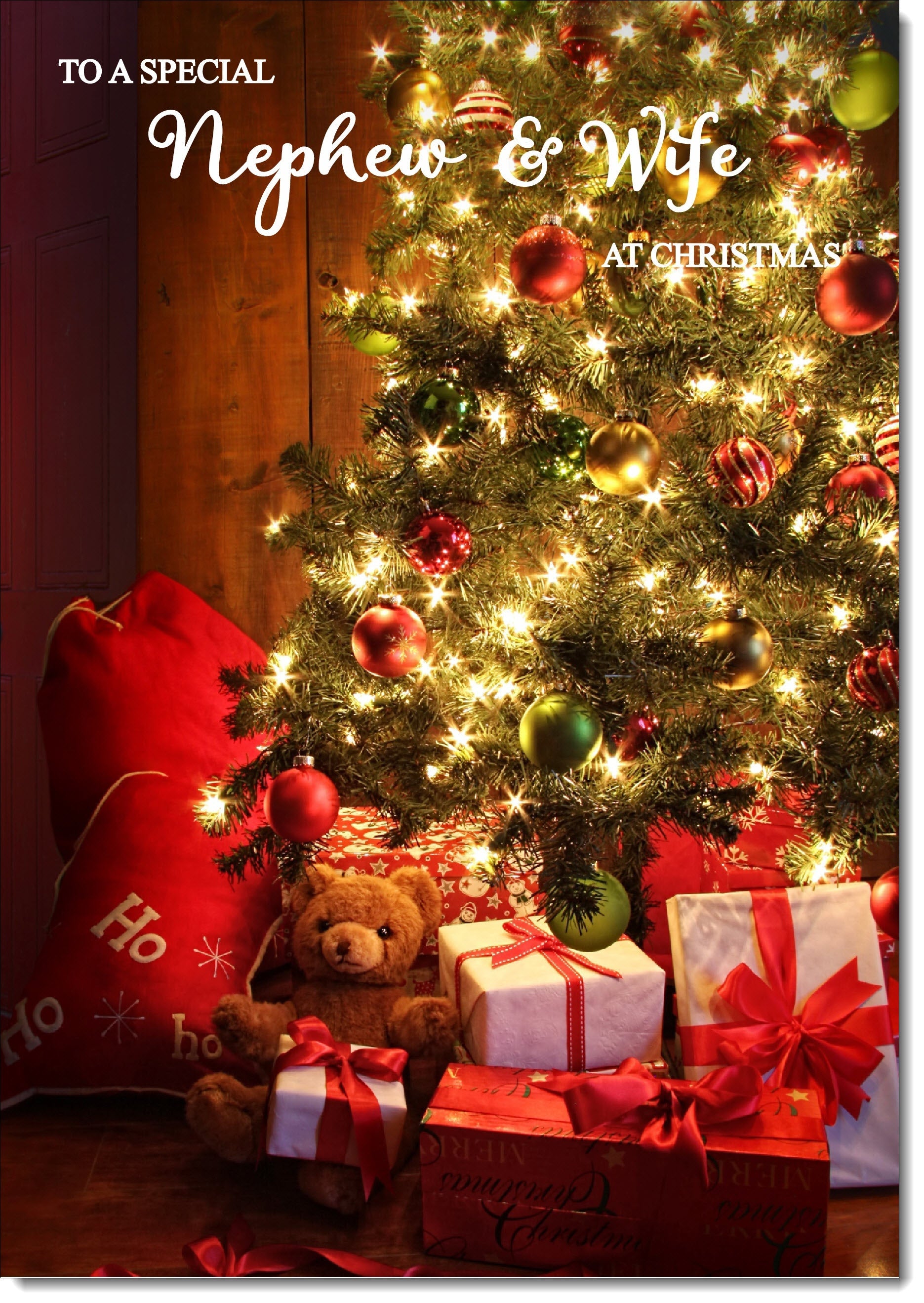 Nephew & Wife Christmas Card Teddy by Christmas Tree