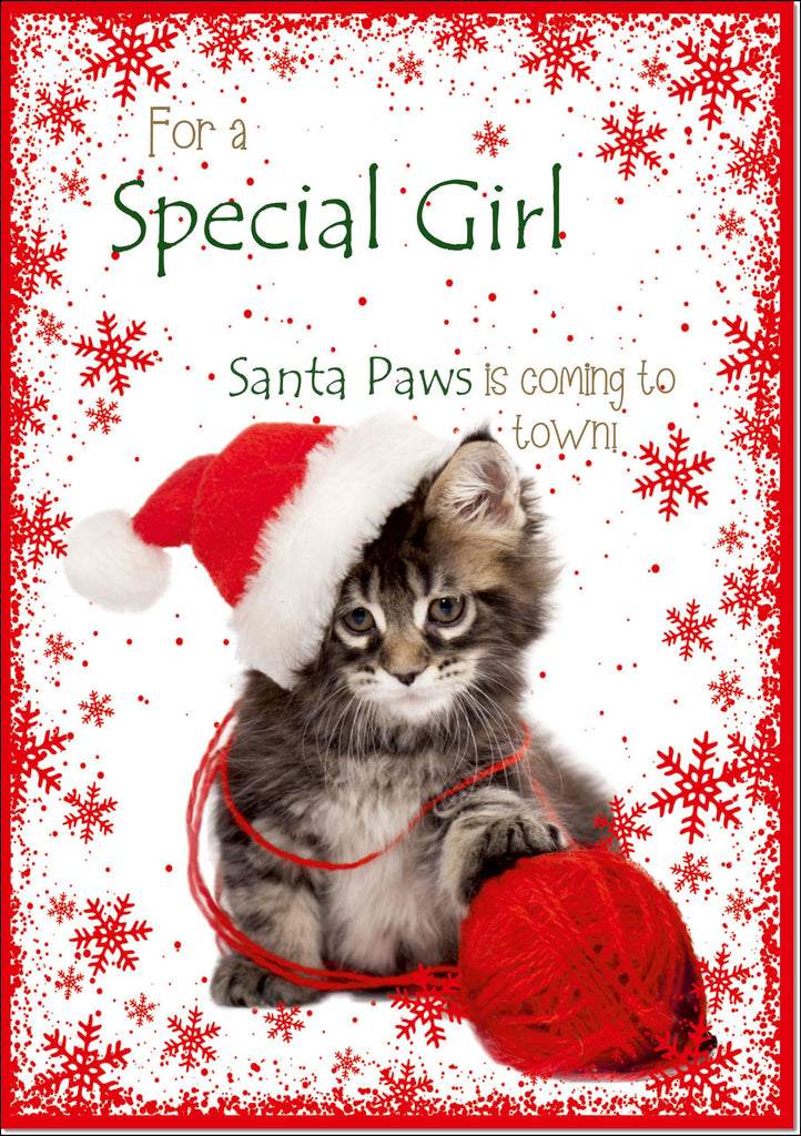 Special Girl Christmas Card Cute Santa Paws Kitten Cat Pet