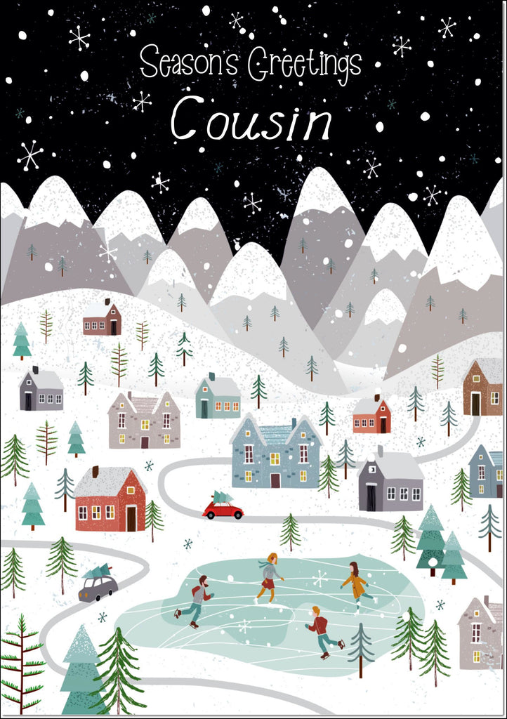 Cousin Christmas Card Mountain Scene In Snowy Village