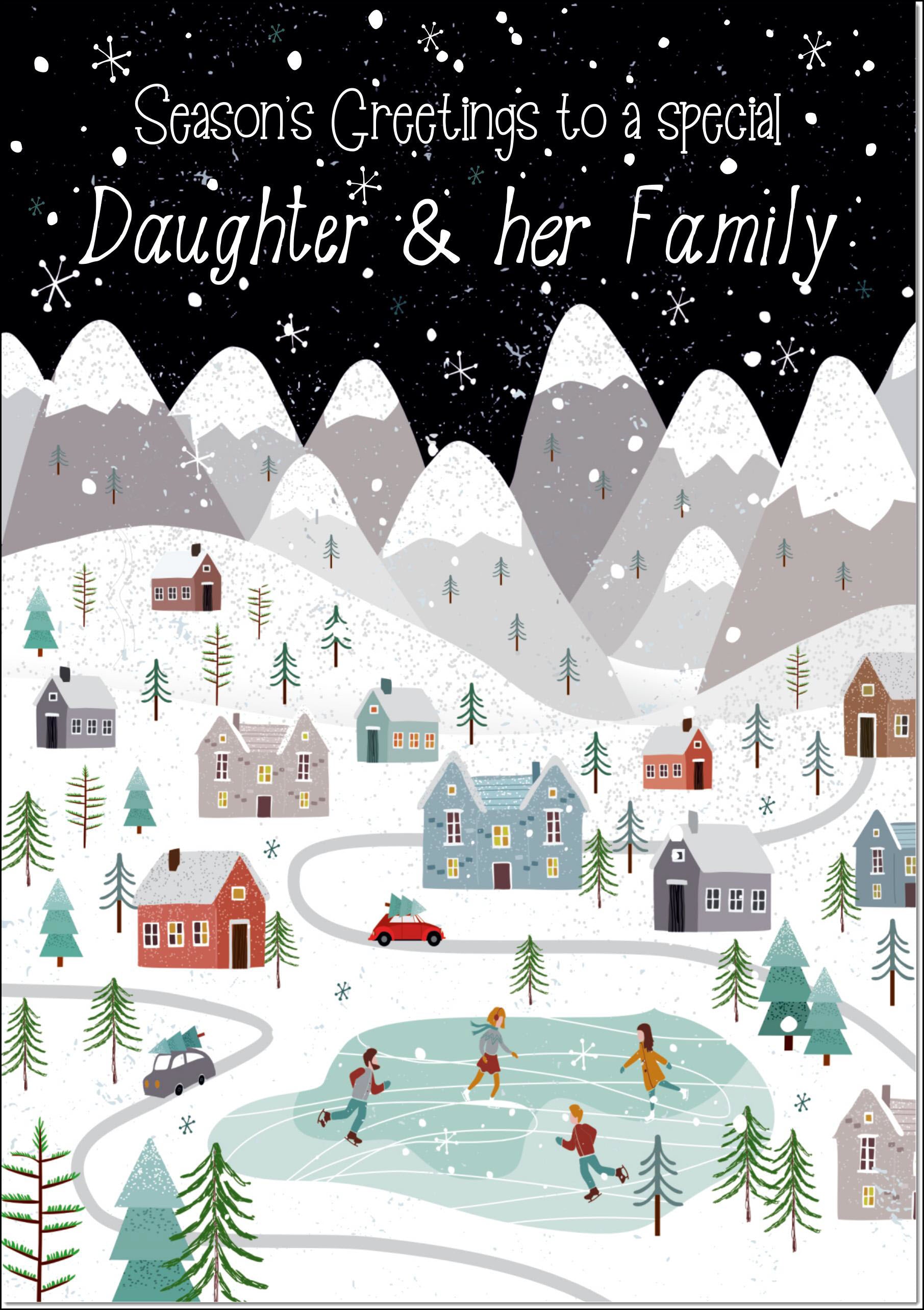 Daughter & Family Christmas Card Mountain Scene In Snowy Village