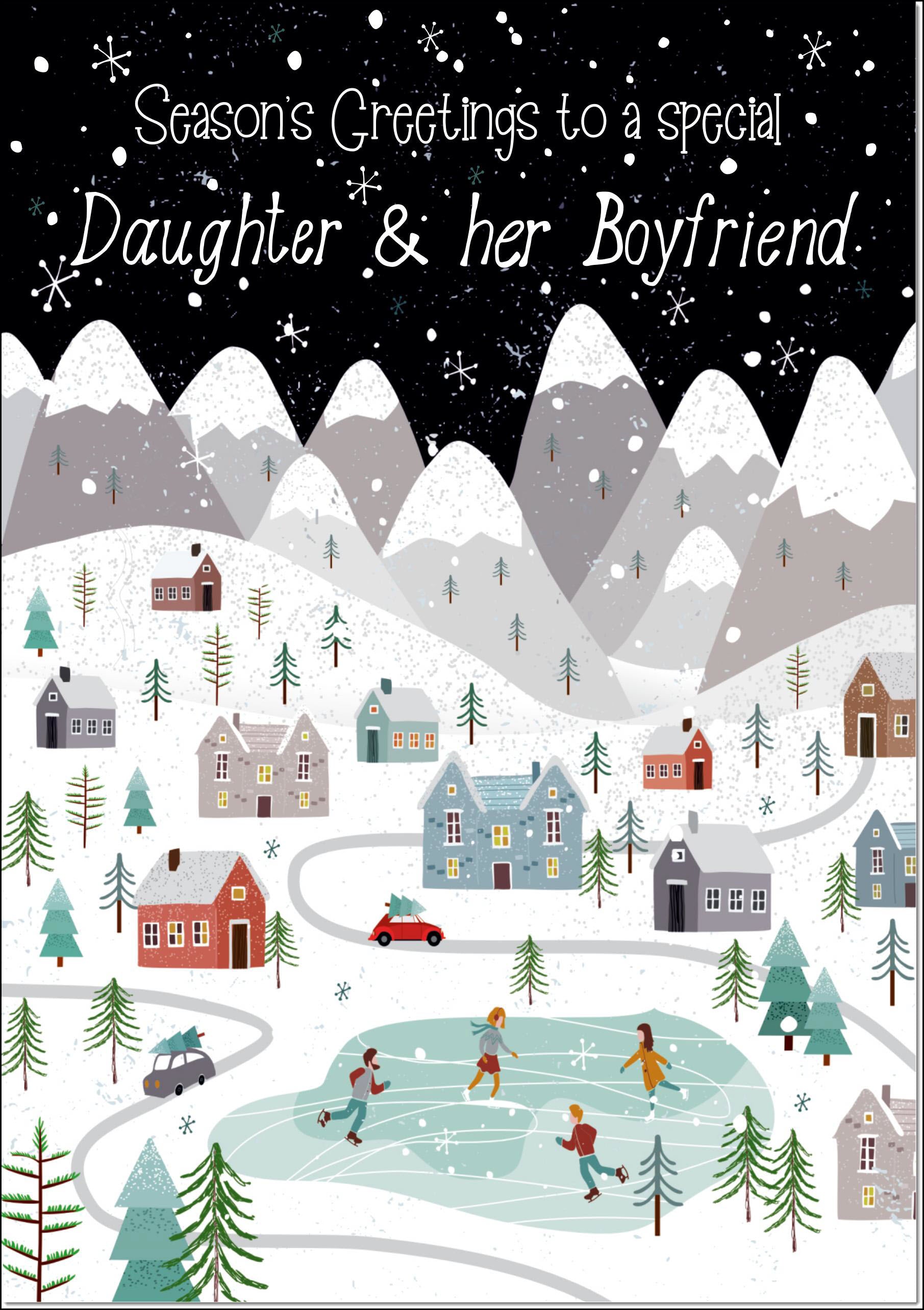 Daughter & Boyfriend Christmas Card Mountain Scene In Snowy Village