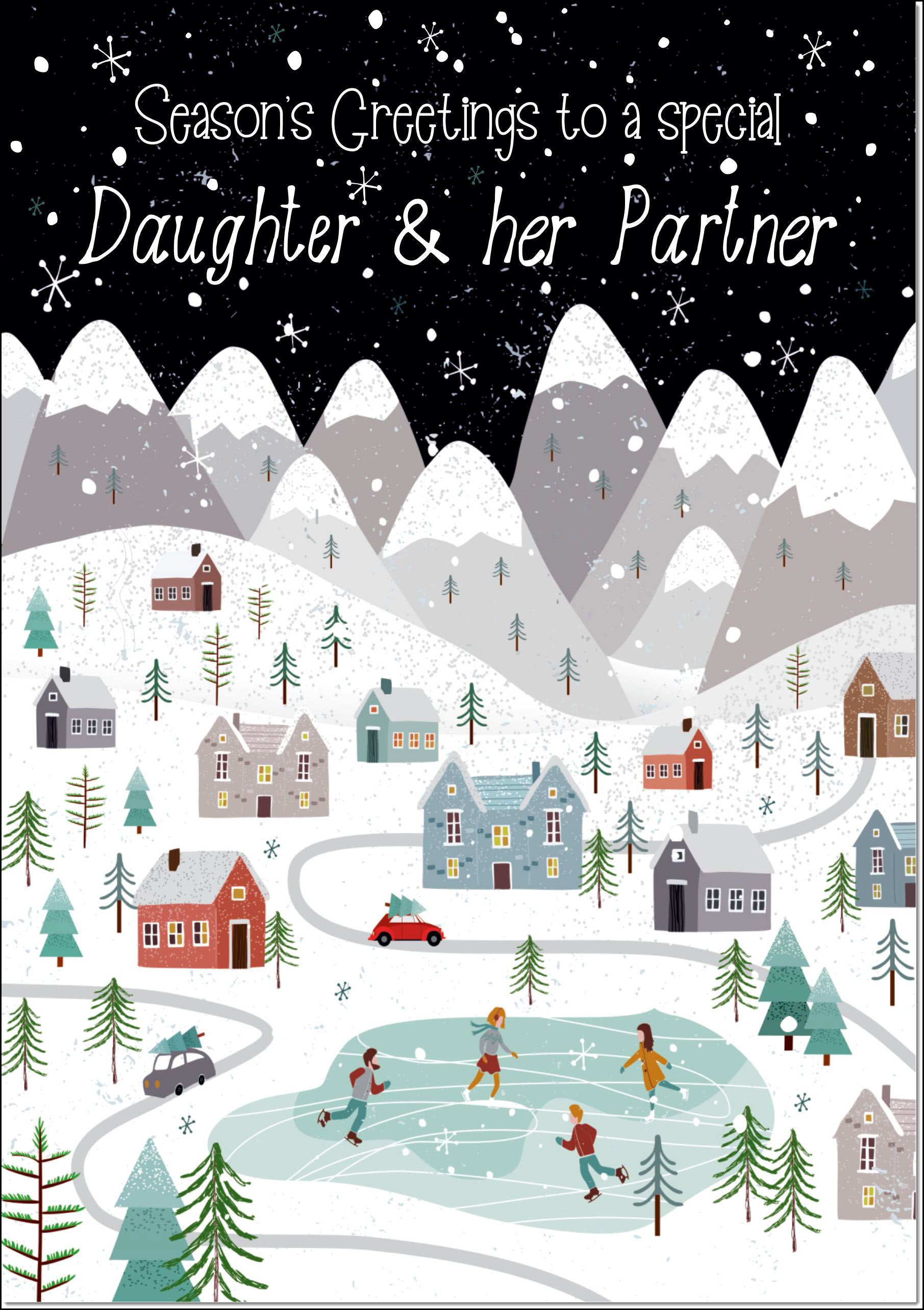 Daughter & Partner Christmas Card Mountain Scene In Snowy Village