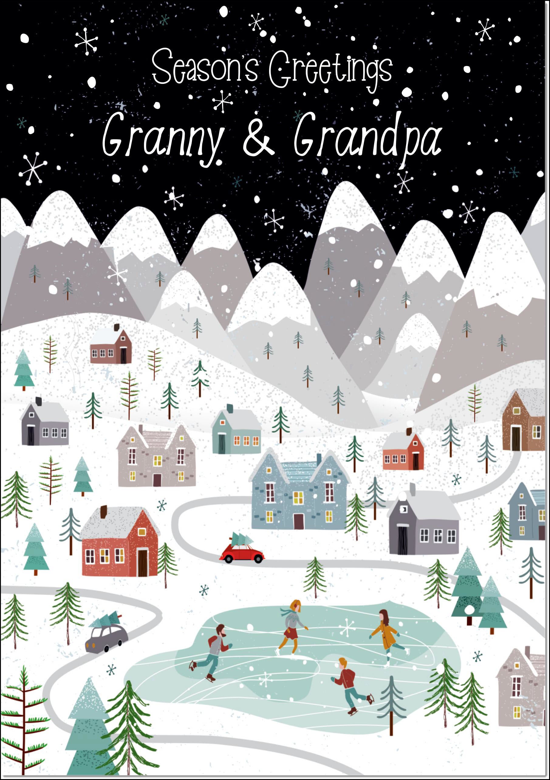 Granny & Grandpa Christmas Card Mountain Scene In Snowy Village