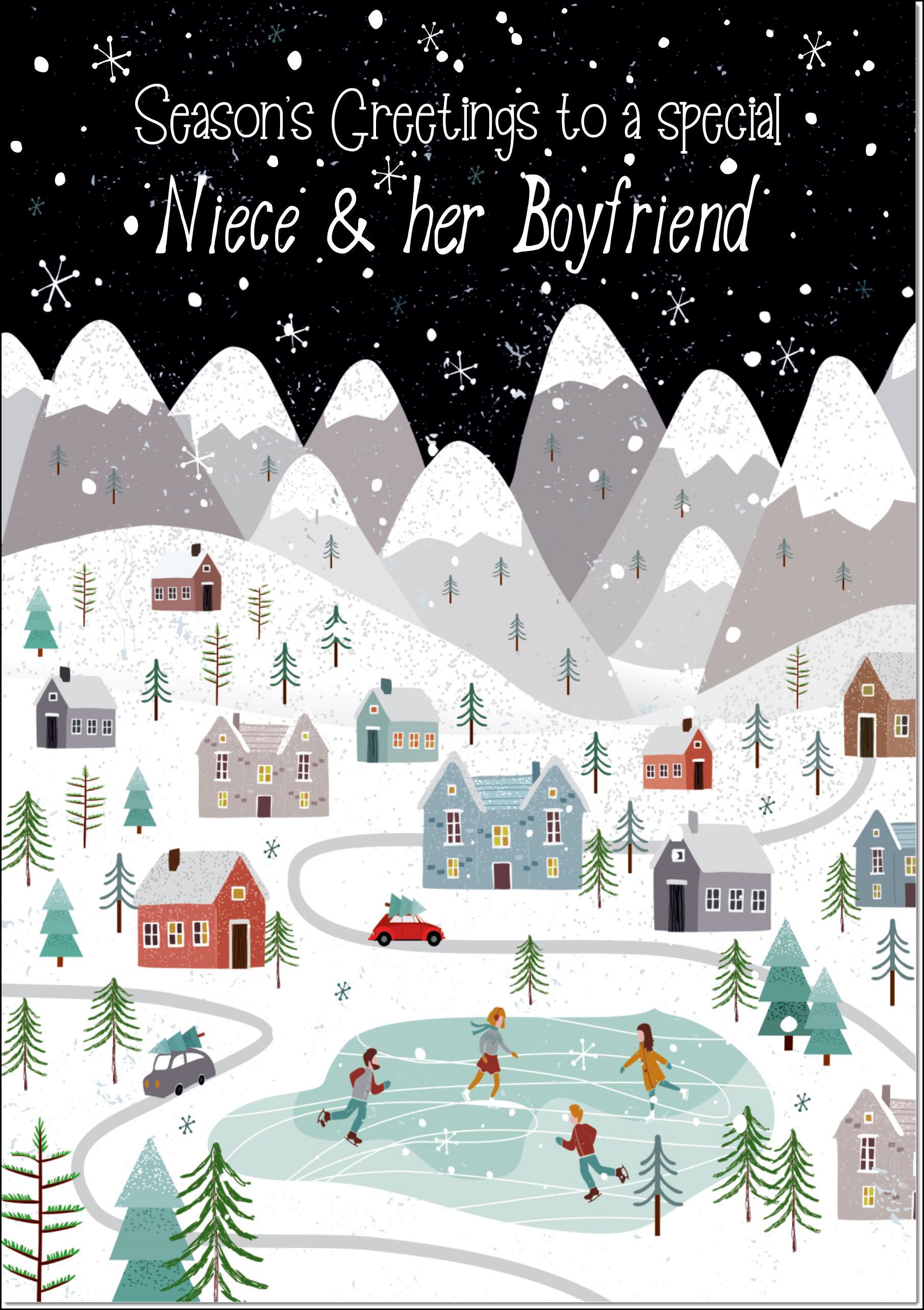 Niece & Boyfriend Christmas Card Mountain Scene In Snowy Village