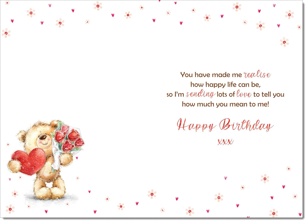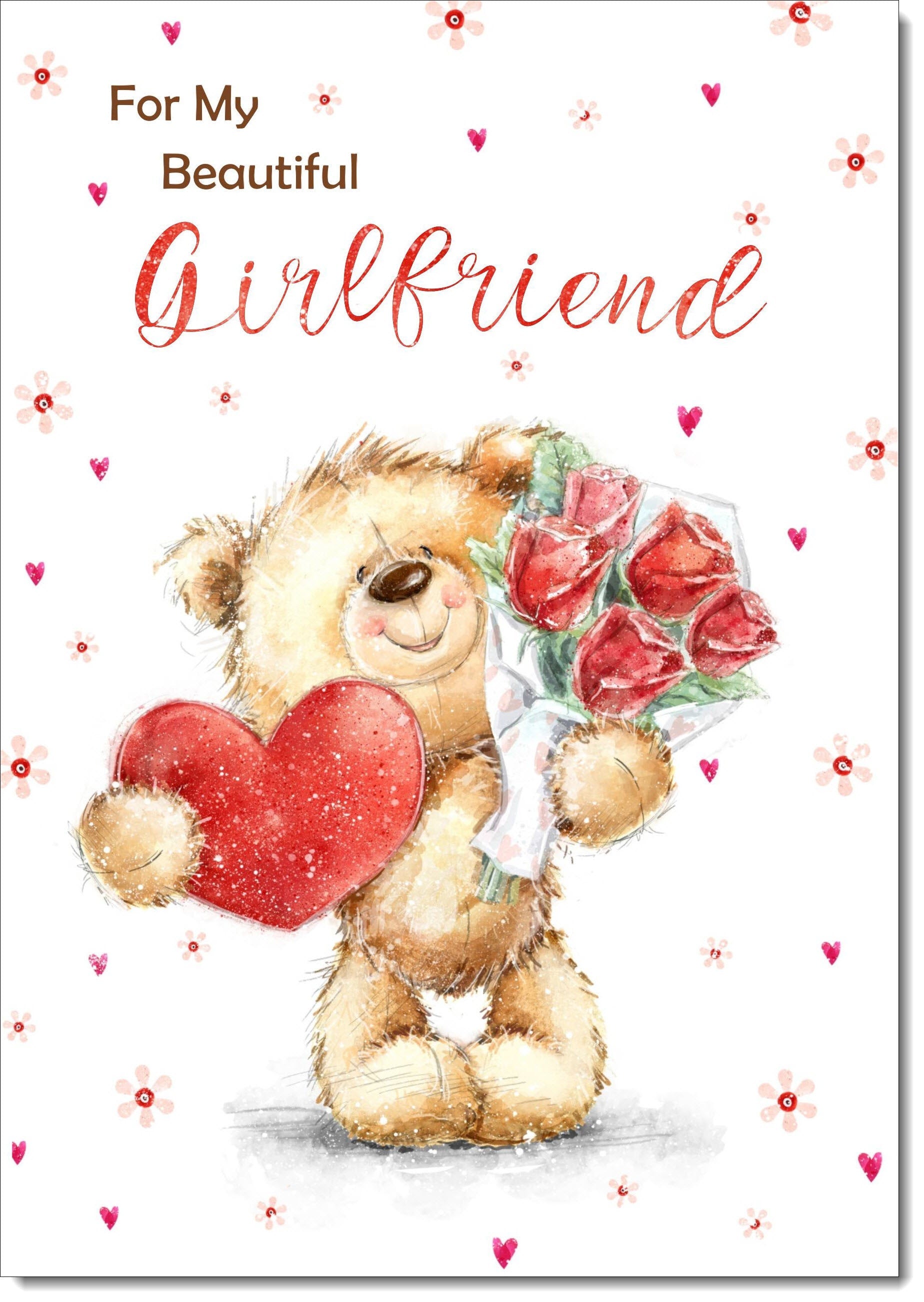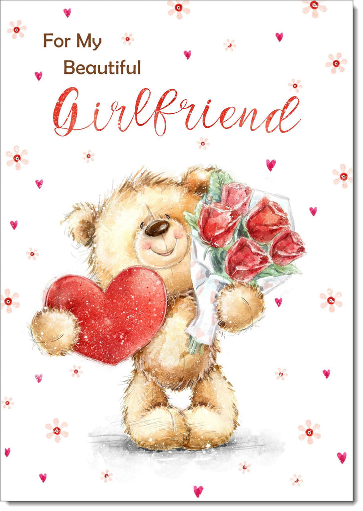 Girlfriend Birthday Card Teddy with Love Heart and Flowers