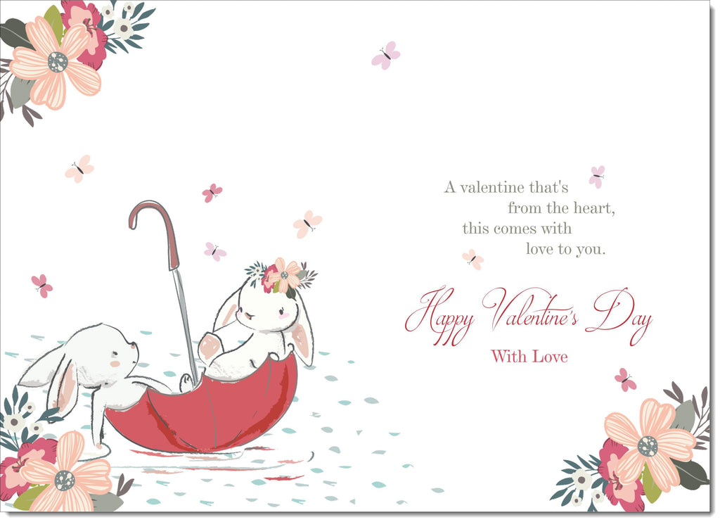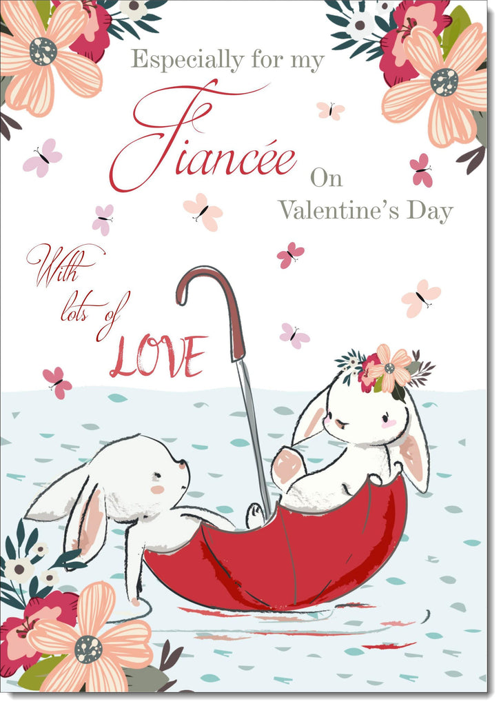 Fiancee Valentines Card Rabbits Floating in Whimsical Umbrella