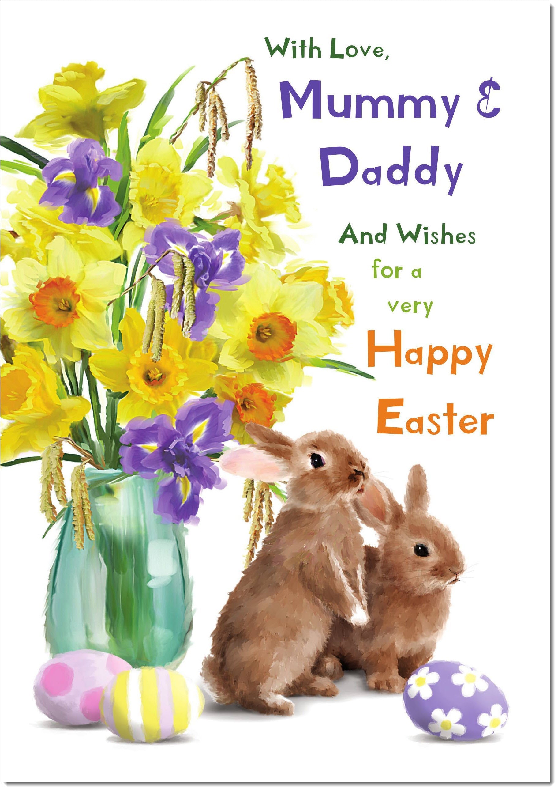 Mummy & Daddy Easter Card Vase of Daffodils with Bunnies and Eggs