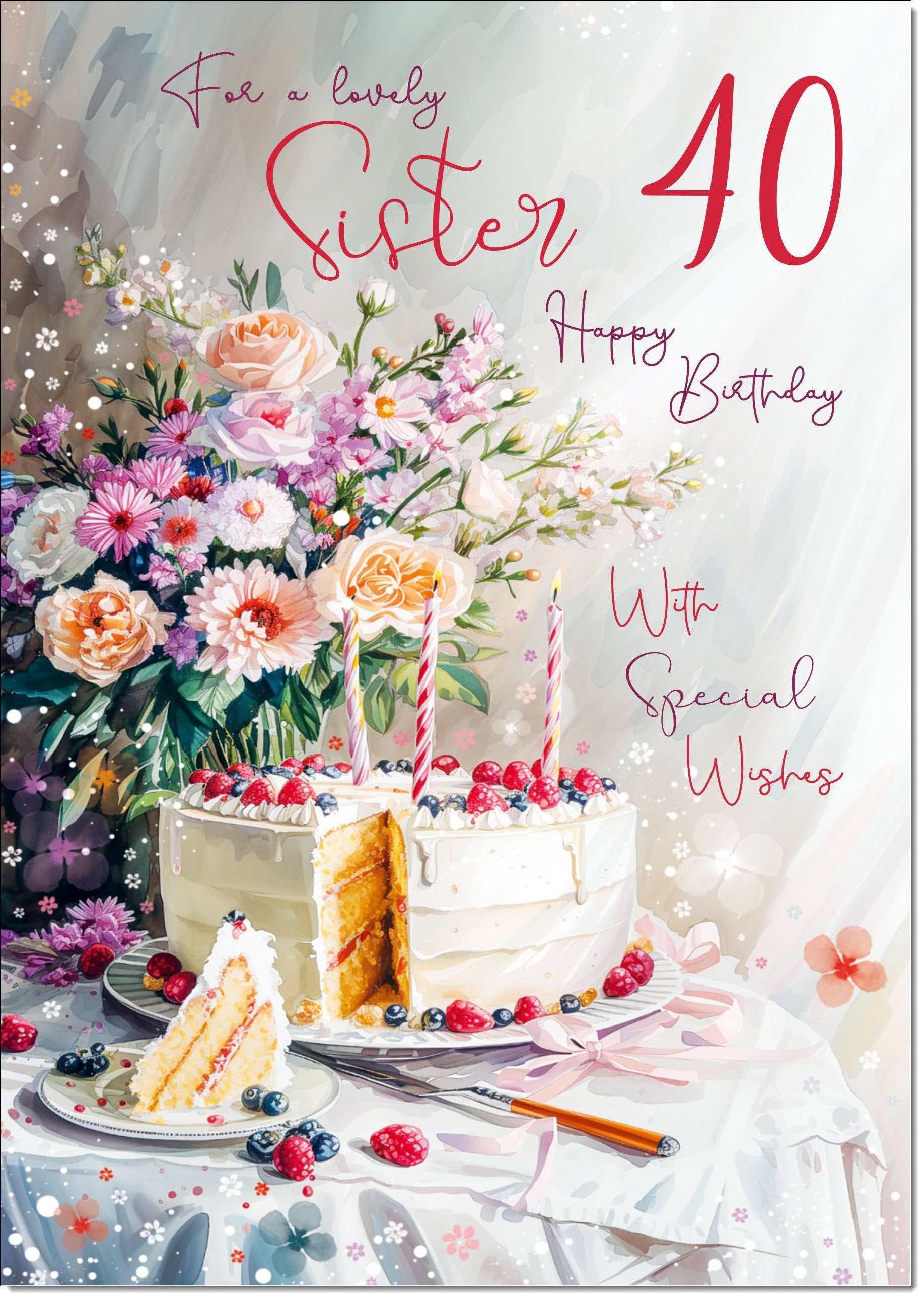 Sister 40th Birthday Card Age 40 Birthday Cake and Flowers