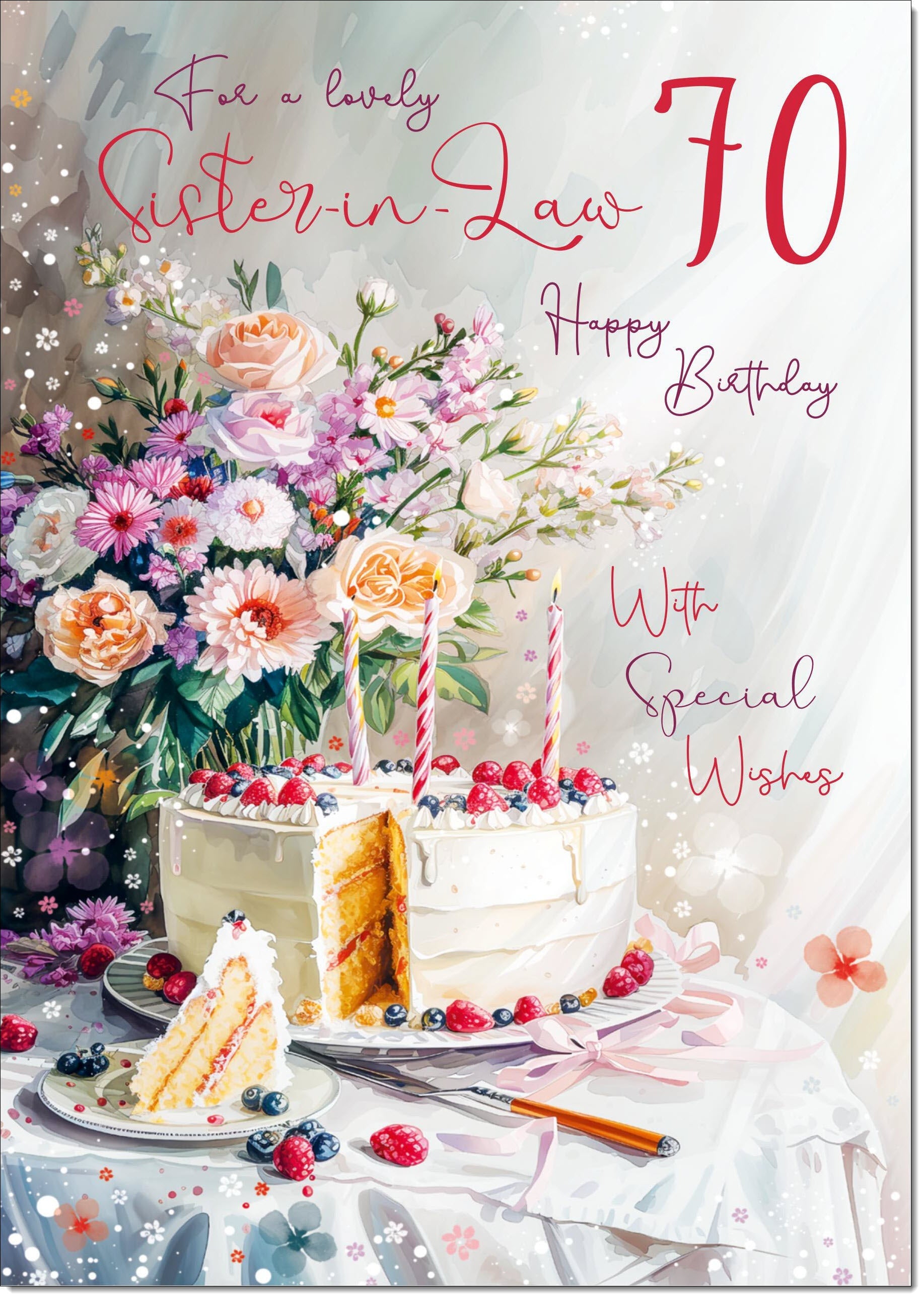 Sister-in-Law 70th Birthday Card Age 70 Birthday Cake and Flowers