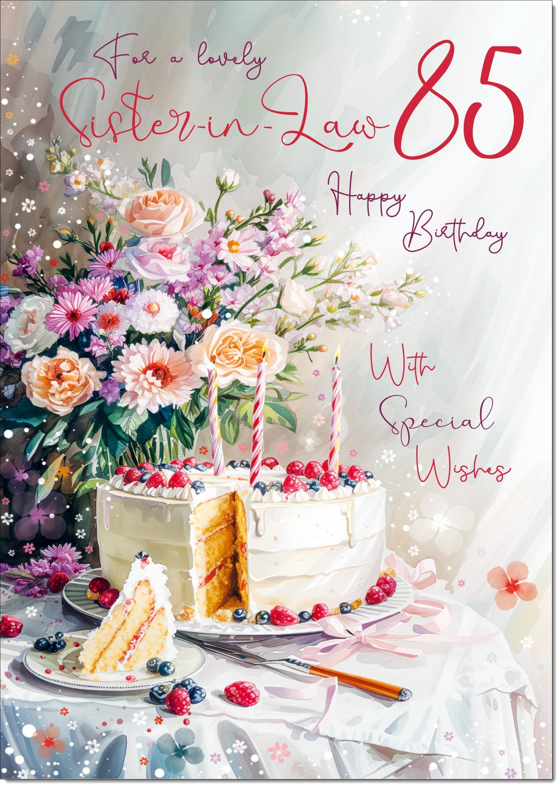 Sister-in-Law 85th Birthday Card Age 85 Birthday Cake and Flowers