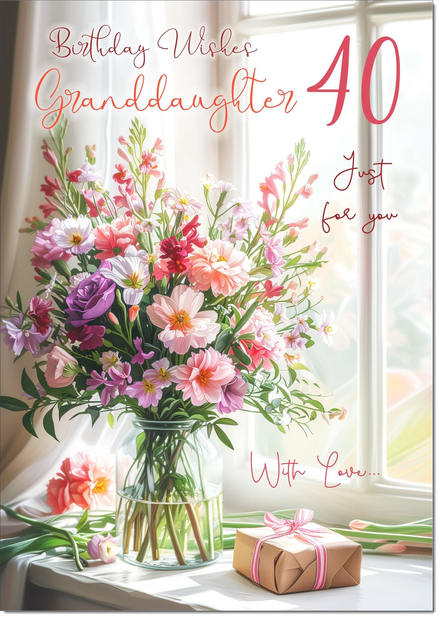 Granddaughter 40th Birthday Card Age 40 Flower Bouquet and Present