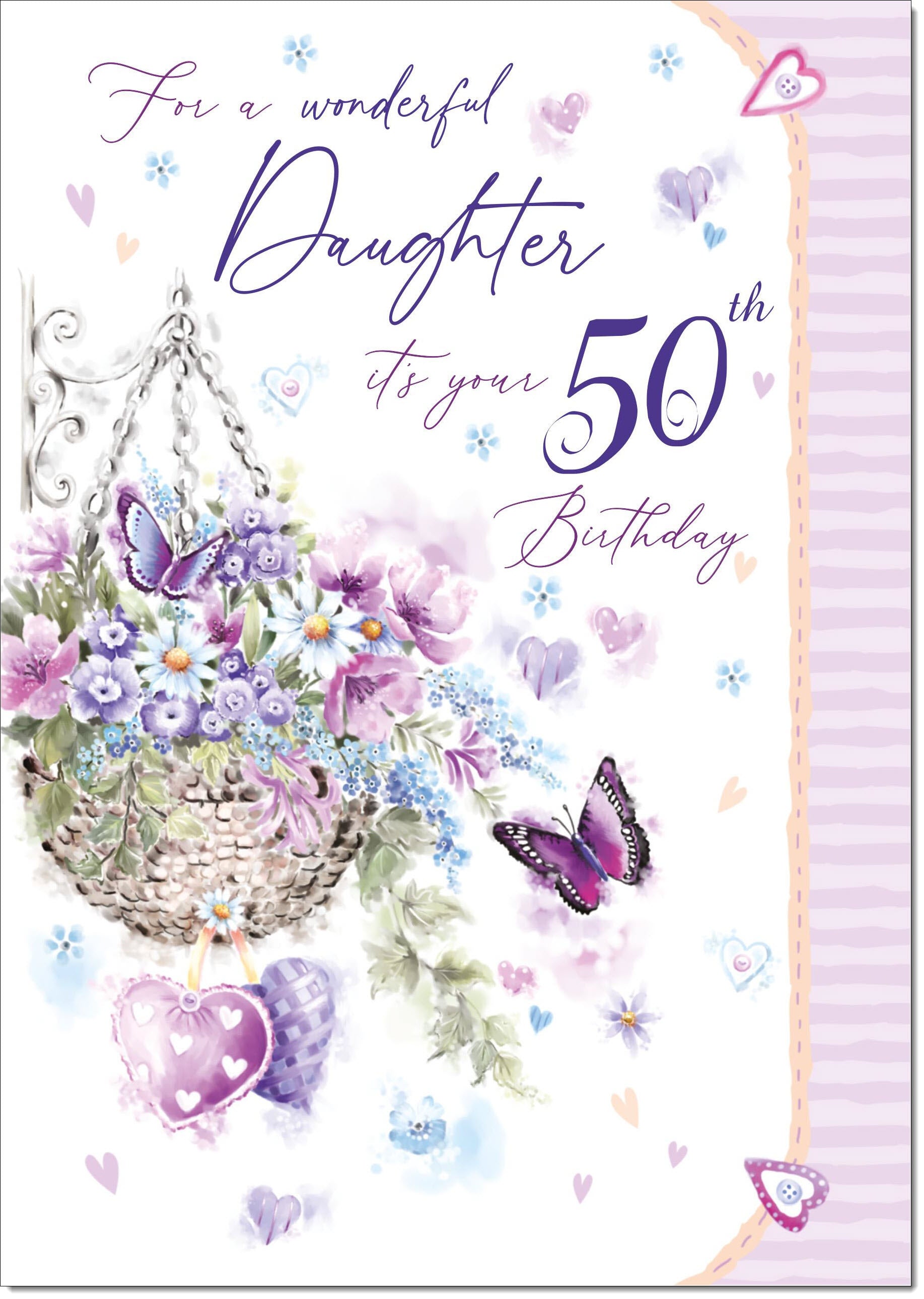 Daughter 50th Birthday Card Age 50 Purple Hanging Basket