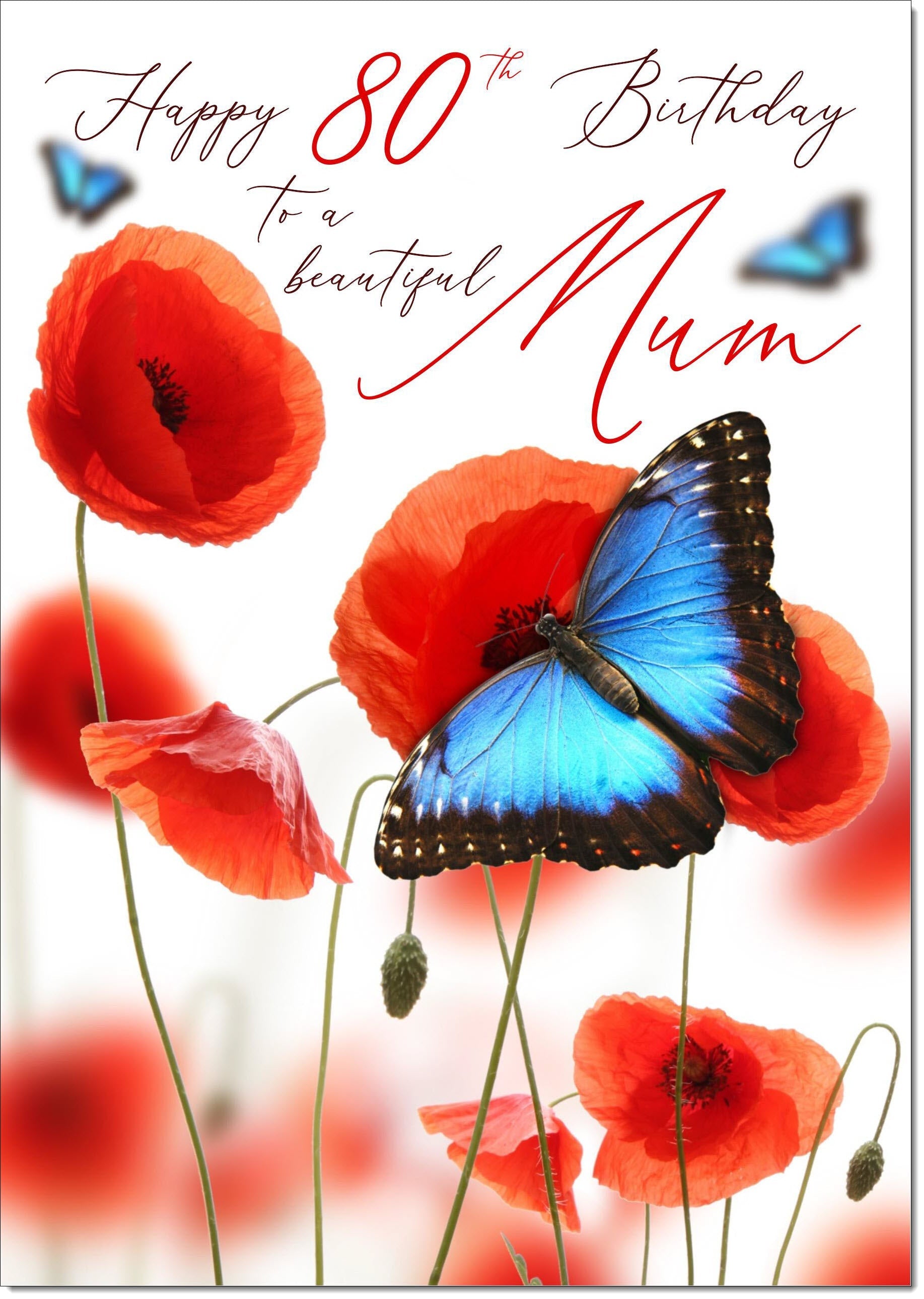 Mum 80th Birthday Card Age 80 Poppies and Blue Butterflies