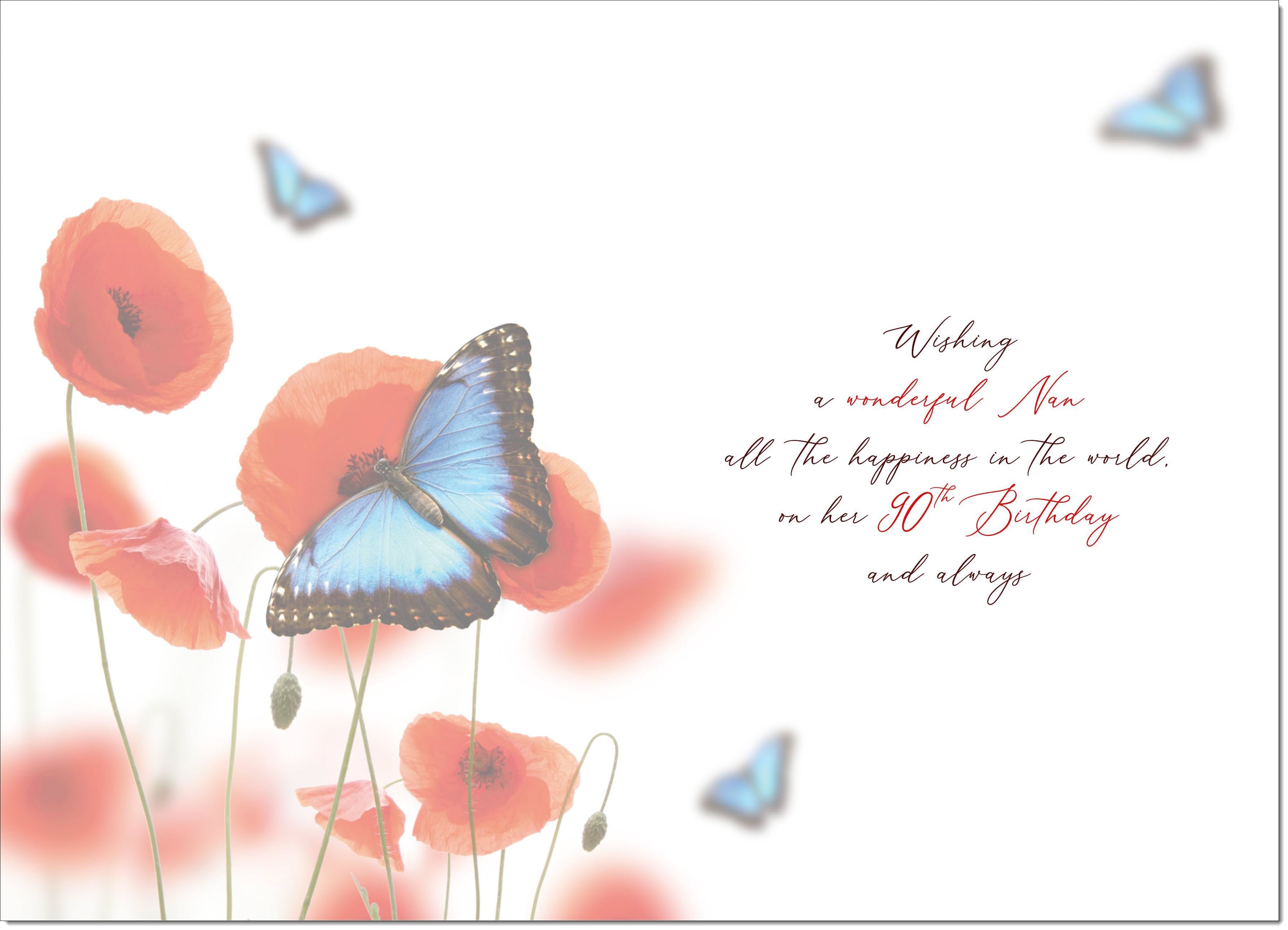 Nan 90th Birthday Card Age 90 Poppies and Blue Butterflies