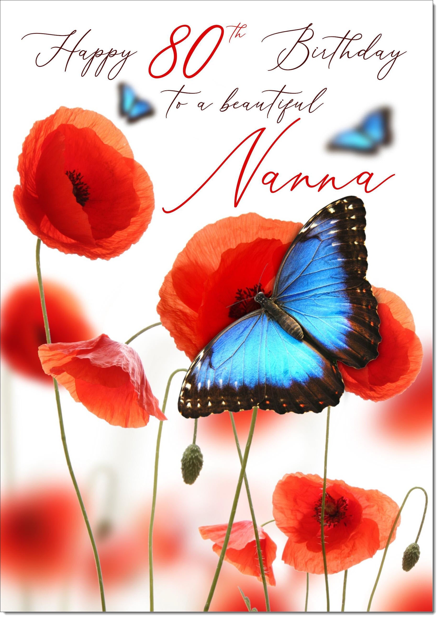 Nana 80th Birthday Card Age 80 Poppies and Blue Butterflies