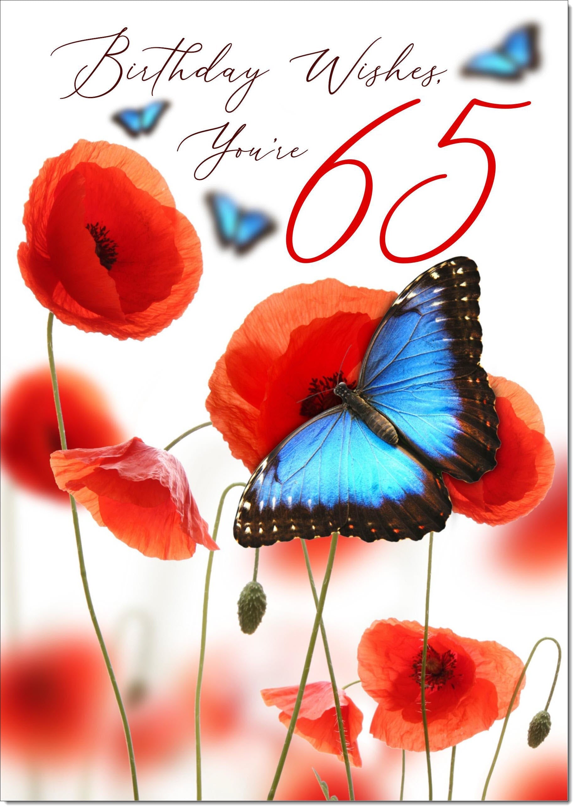 65th Birthday Card Age 65 for Her Poppies and Blue Butterflies